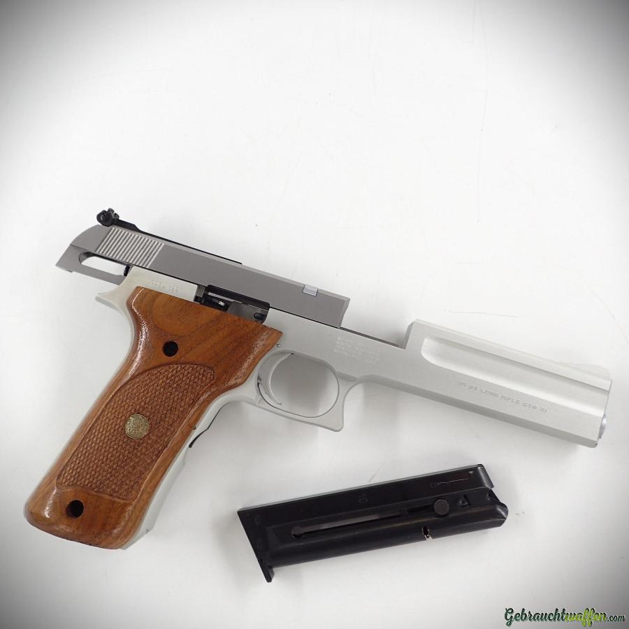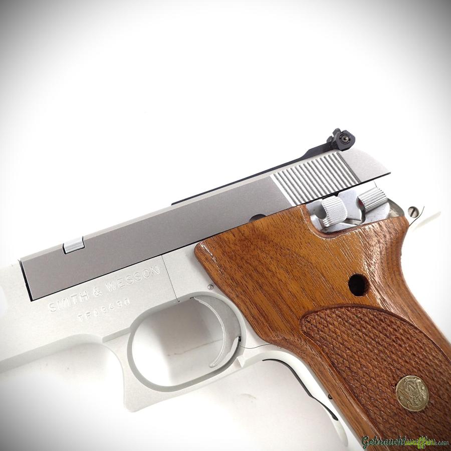 S&W Modell 622 Pistole, Kaliber .22 LR, 10-Schuss-Magazin, 4,5-Zoll-Lauf, leichtes Aluminiumgehäuse, verstellbare Kimme, in sehr gutem Zustand, inklusive Bedienungsanleitung.
