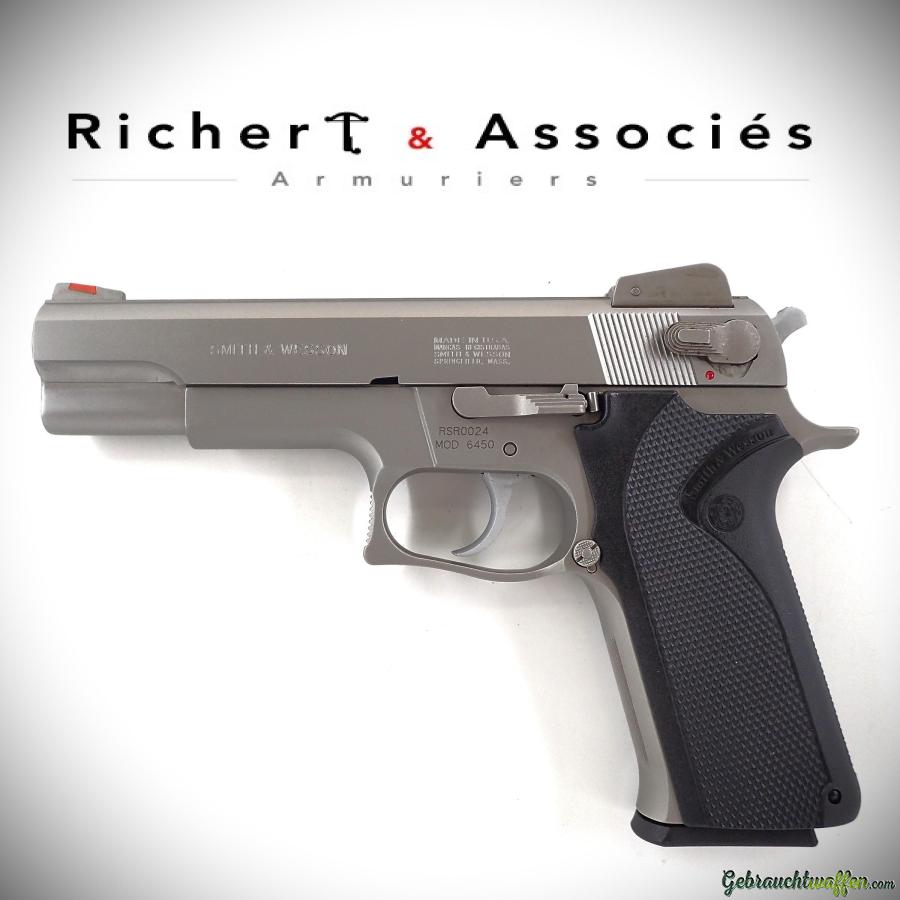 Rare pistolet Smith & Wesson mod. 6450, cal. 45acp, full-size, canon de 5 pouces, culasse et carcasse en acier, détente traditionnelle SA/DA, levier de désarmement du chien ambidextre, hausse réglable, modèle de transition de la série ''RSR'' fabriqué à moins de 200 exemplaires au début des années 90, occasion neuve, jamais tiré, livré avec sa boîte, accessoires et 2ème chargeur d'origine.