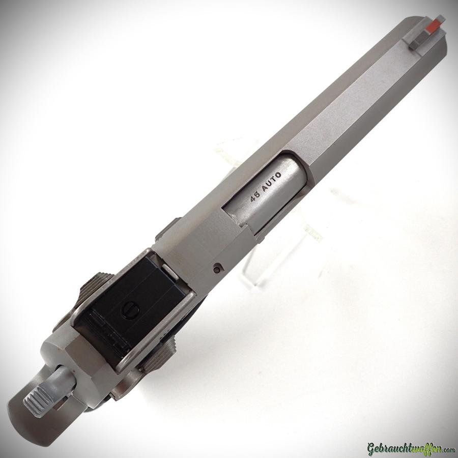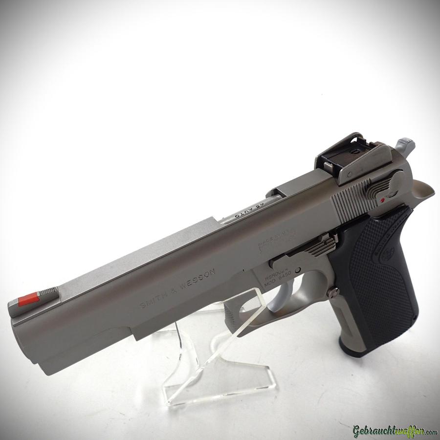 Seltene Pistole Smith & Wesson Mod. 6450, Kaliber 45acp, Full-Size, 5-Zoll-Lauf, Verschluss und Rahmen aus Stahl, traditioneller SA/DA-Abzug, beidhändig bedienbarer Abzugsverriegelungshebel, verstellbare Kimme, Übergangsmodell der Serie "RSR", von dem Anfang der 90er Jahre weniger als 200 Exemplare hergestellt wurden, neuwertig, unbenutzt, Lieferung mit Originalverpackung, Zubehör und zweitem Originalmagazin.