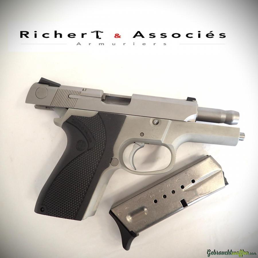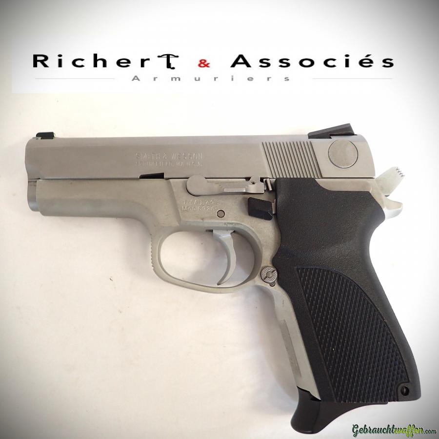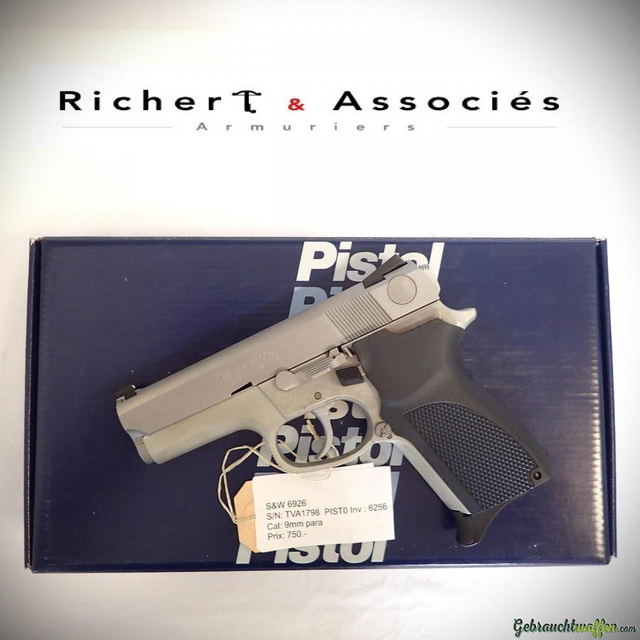 Pistolet Smith & Wesson mod. 6926, cal. 9mmP, canon de 3.5 pouces, carcasse en alliage léger et culasse en acier inox, levier de désarmement du chien sur la carcasse, hausse Novak, fabriqué en 1991, occasion neuve, jamais tiré, livré avec sa boîte, accessoires et 2ème chargeur d'origine.