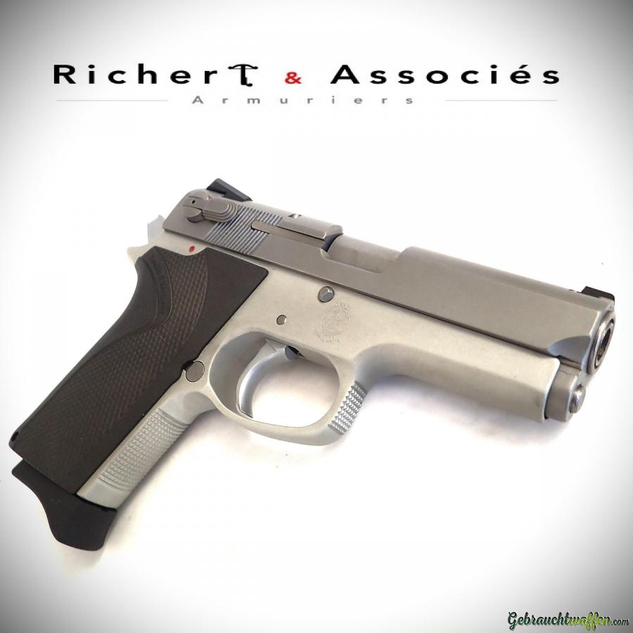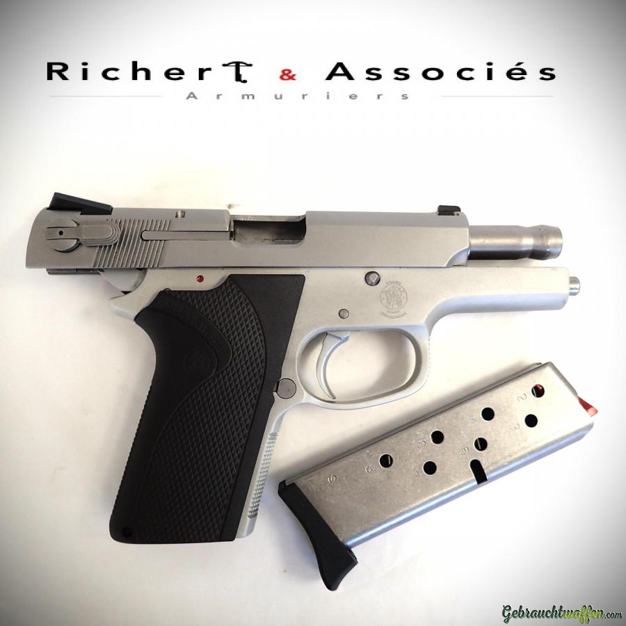 Pistolet compact de 3ème génération Smith & Wesson, mod. 3913, cal. 9mmP, canon de 3.5 pouces, chargeur 8 coups, levier de sécurité ambidextre, marteau type "bobbed", visée Novak, occasion neuve, jamais tiré, livré avec sa boîte, accessoires et 2ème chargeur d'origine.