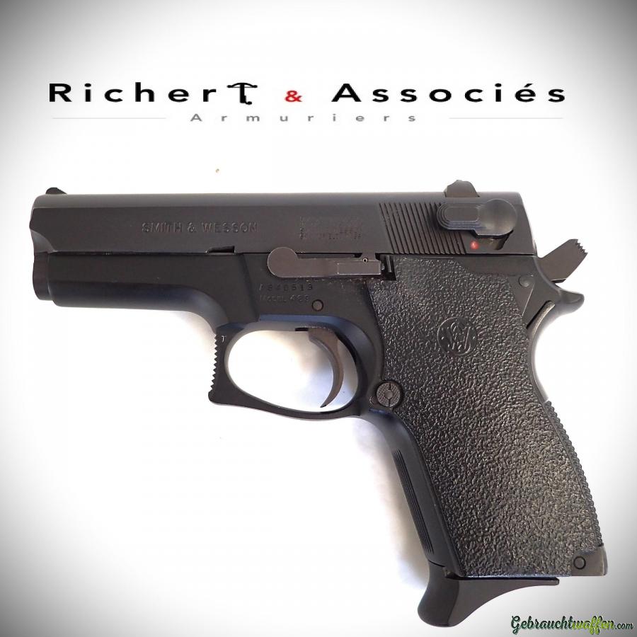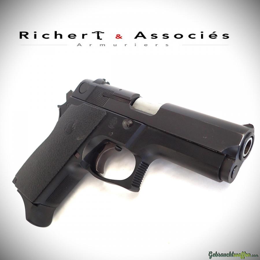Pistolet compact de 2ème génération Smith & Wesson, mod. 469, cal. 9mmP, canon de 3.5 pouces, chargeur 12 coups, carcasse en alliage léger et culasse en acier, détente DA/SA, marteau type "bobbed", occasion neuve, jamais tiré, livré avec sa boîte, accessoires et 2ème chargeur d'origine.