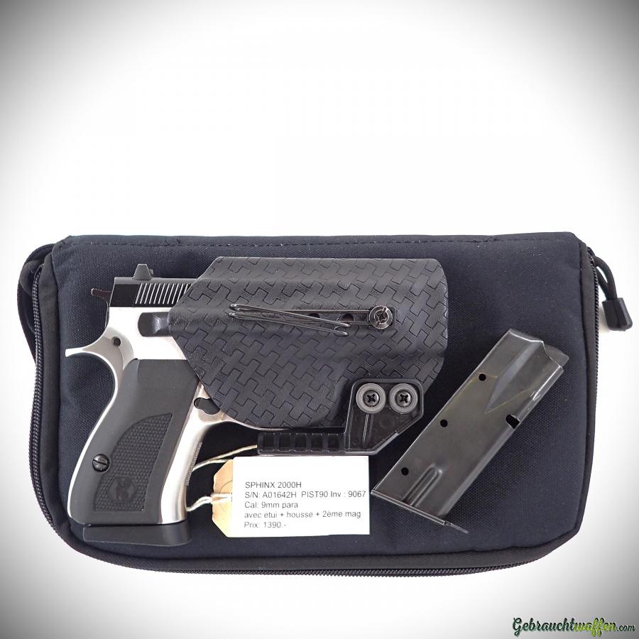 Pistolet Sphinx mod. 2000H, cal. 9mmP, canon de 3.5 pouces, carcasse et culasse en acier, détente DA/SA, finition duo-tone, leviers de sécurité et de culasse ambidextre, hausse fixe, en très bon état, livré avec un étui en polymère, une housse et 2ème chargeur.