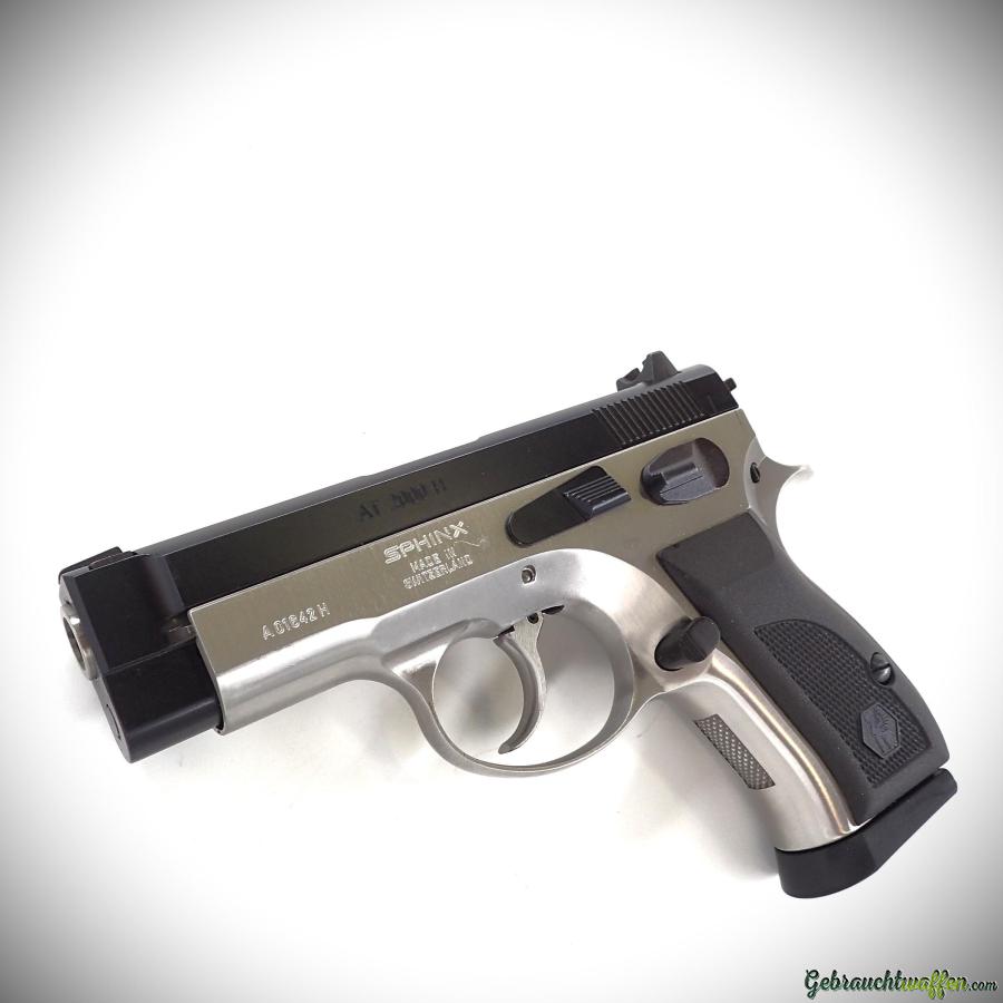 Pistolet Sphinx mod. 2000H, cal. 9mmP, canon de 3.5 pouces, carcasse et culasse en acier, détente DA/SA, finition duo-tone, leviers de sécurité et de culasse ambidextre, hausse fixe, en très bon état, livré avec un étui en polymère, une housse et 2ème chargeur.