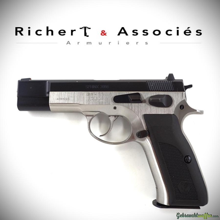 Pistolet Sphinx mod. 2000S, cal. 9mmP, chargeur 15 coups, carcasse et culasse en acier, finition duo-tone, organes de visée fixes, en très bon état, livré avec sa boîte, manuels et 2éme chargeur d'origine.
