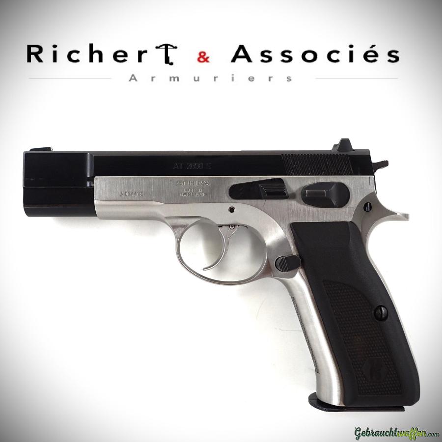 Pistolet Sphinx mod. 2000S, cal. 9mmP, chargeur 15 coups, carcasse et culasse en acier, finition duo-tone, organes de visée fixes, en très bon état, livré avec un 2ème chargeur.
