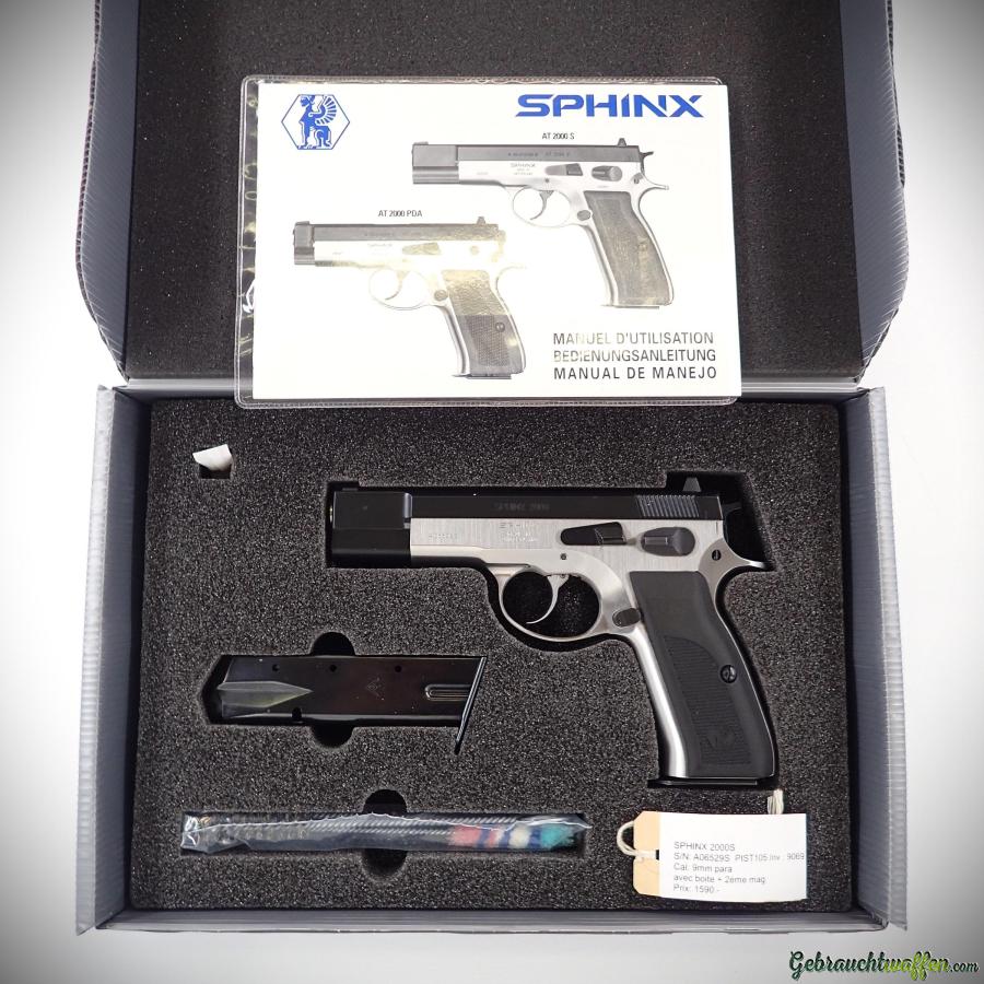 Sphinx Pistole Mod. 2000S, Kaliber 9 mm P, 15-Schuss-Magazin, Stahlrahmen und -schlitten, Duo-Tone-Finish, feste Visierung, in sehr gutem Zustand, mit Box, Handbüchern und zweitem Originalmagazin.