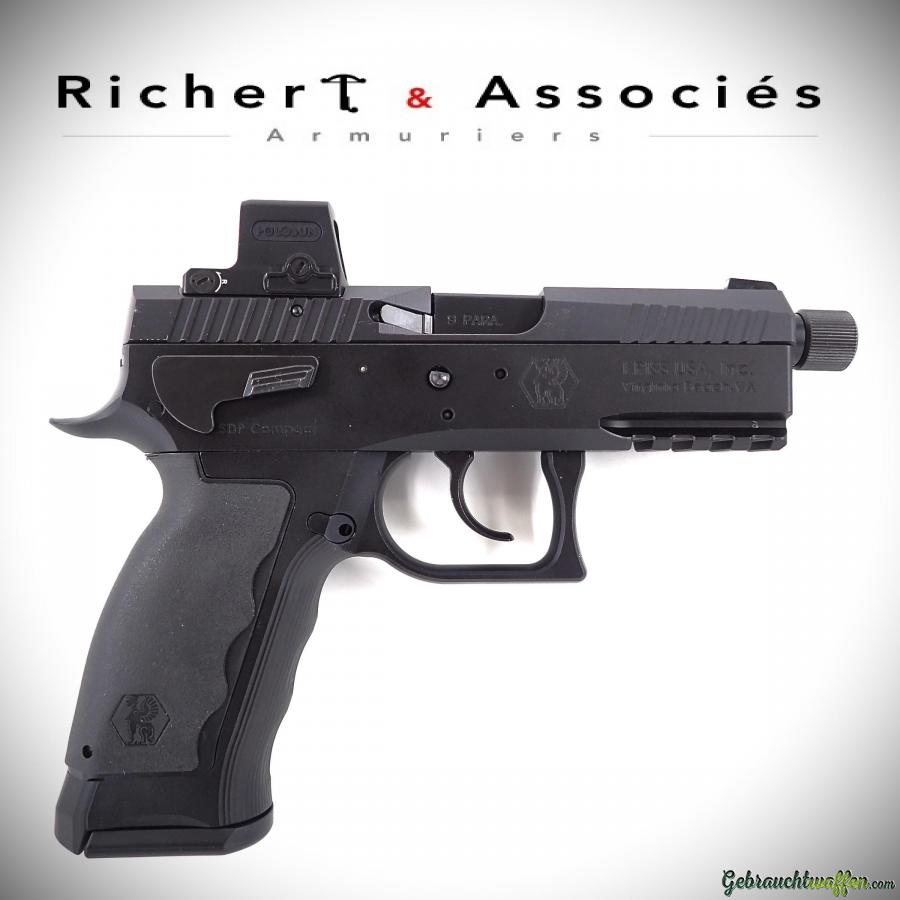 Pistolet Sphinx mod. SDP Compact Duty, cal. 9mmP, canon de 4 pouces fileté, détente DA/SA, carcasse en alliage léger avec rail accessoires, levier de désarmement du chien ambidextre, équipé d'une visée point-rouge Holosun solaire, arme neuve, jamais tiré, livré avec sa boîte-mallette, accessoires et 2ème chargeur d'origine.