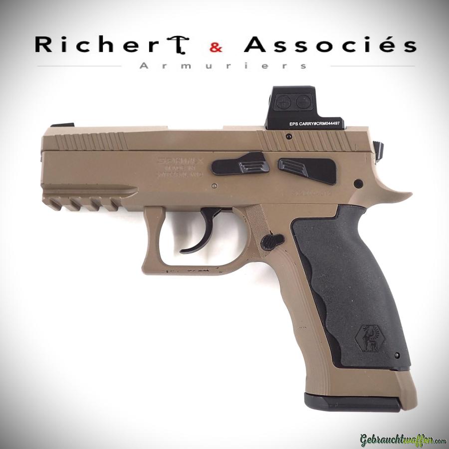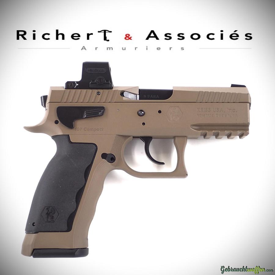 Pistolet Sphinx mod. SDP Compact Duty, cal. 9mmP, canon de 4 pouces, finition couleur ''Sand'', détente DA/SA, carcasse en alliage léger avec rail accessoires, levier de désarmement du chien ambidextre, équipé d'une visée point-rouge Holosun solaire, arme neuve d'exposition, jamais tiré mais présente quelques marques d'usure, livré avec sa boîte-mallette, accessoires et 2ème chargeur d'origine.