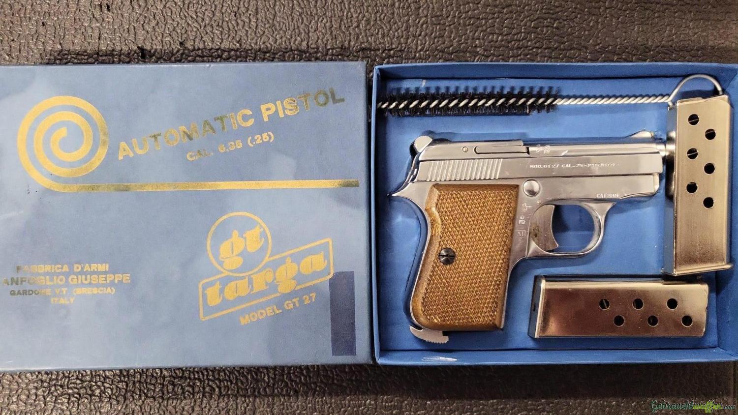 Pistole Tanfoglio, Modell GT 27, Kaliber 6.35, mit zwei Magazinen. Abholung in Sarnen während Bürozeiten. Verkauf nach CH-Waffengesetz mit Waffenerwerbsschein. Versand nach vorgängiger Absprache nach Erledigung der Formalitäten möglich. Keine Garantie und Rücknahme, kein Verkauf ins Ausland.