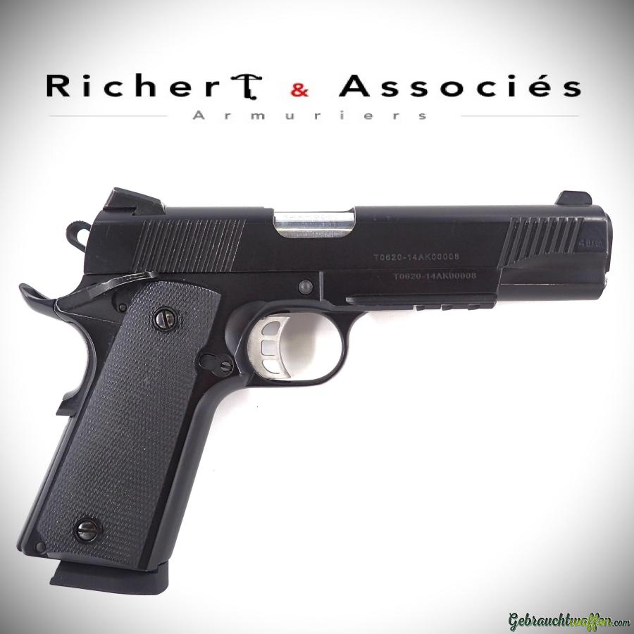 Pistolet TISAS mod. ZIC PC 1911, cal. 45acp, canon de 5 pouces, pédale de sécurité de poignée ''queue de castor'', levier de sécurité de culasse ambidextre, marteau allégé, hausse fixe type Novak, en très bon état, livré avec sa boîte, accessoires et 2ème chargeur.