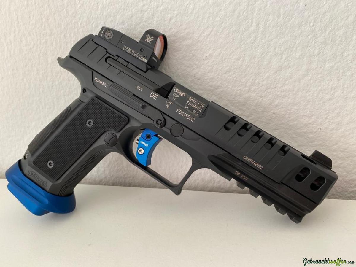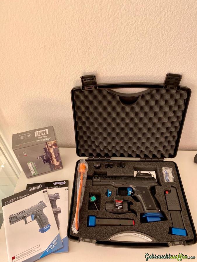 20 Newton Abzugskraft, mit einstellbarem Vorzug und Triggerstop, Expert-Abzugschuh flat/medium und curved/medium, Schließfederstange aus Stahl, Walther Low-Profile Magwell, 3 Stk. 17-Schuss Magazine mit Extension sowie 3 Montageplatten für Red-Dot-Sights von Trijicon, Leupold und Docter/Vortex/Meopta enthalten.