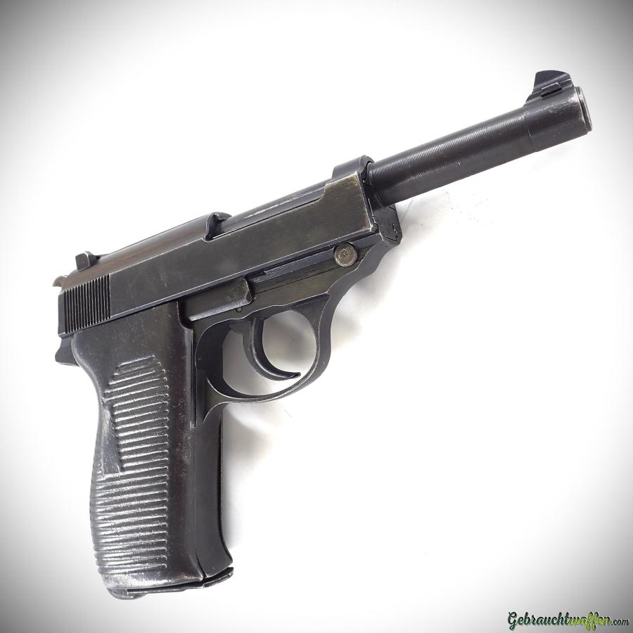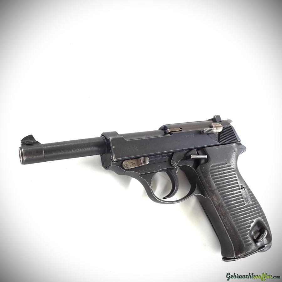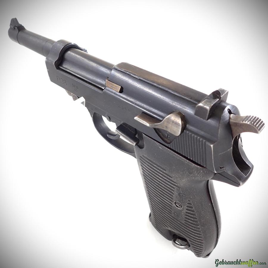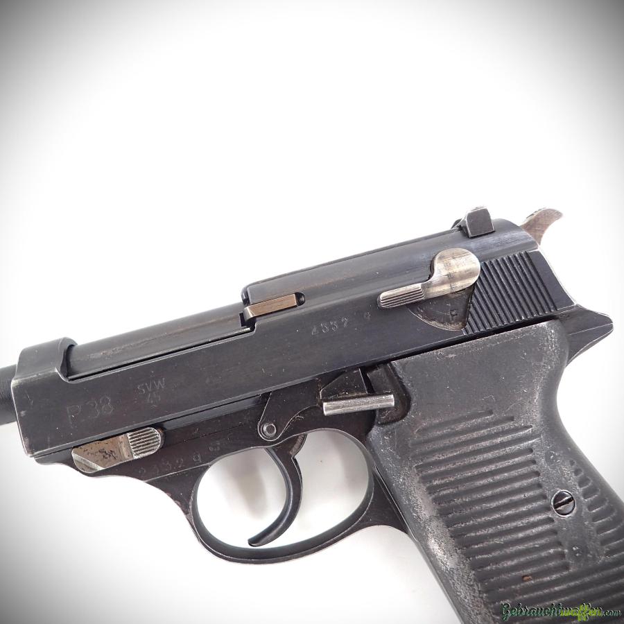 Walther P.38 Pistole, Kaliber 9 mm P, mit französischen Markierungen „SVW“, originalen Stahlgriffschalen, Baujahr 1945, in gutem Zustand.