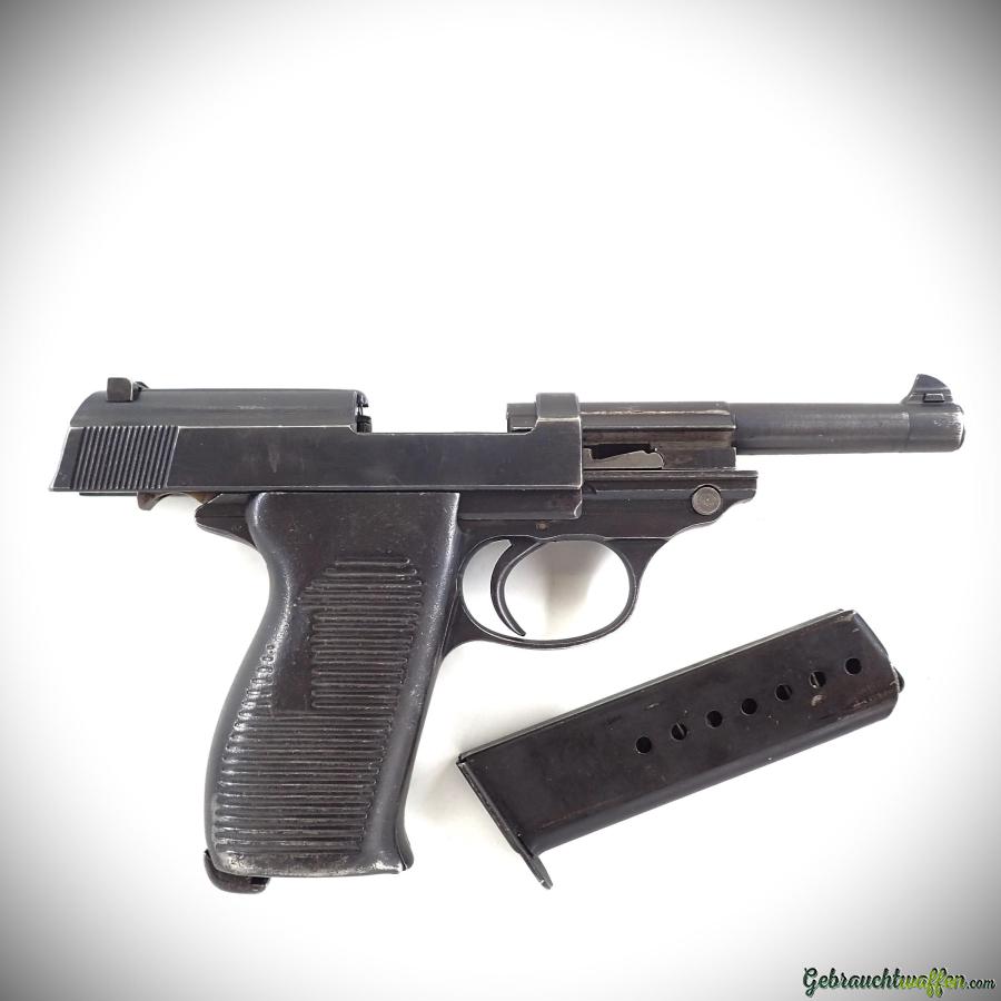 Pistolet Walther mod. P.38, cal. 9mmP, avec marquage Français ''SVW'', plaquettes en acier d'origine, fabriqué en 1945, en bon état.