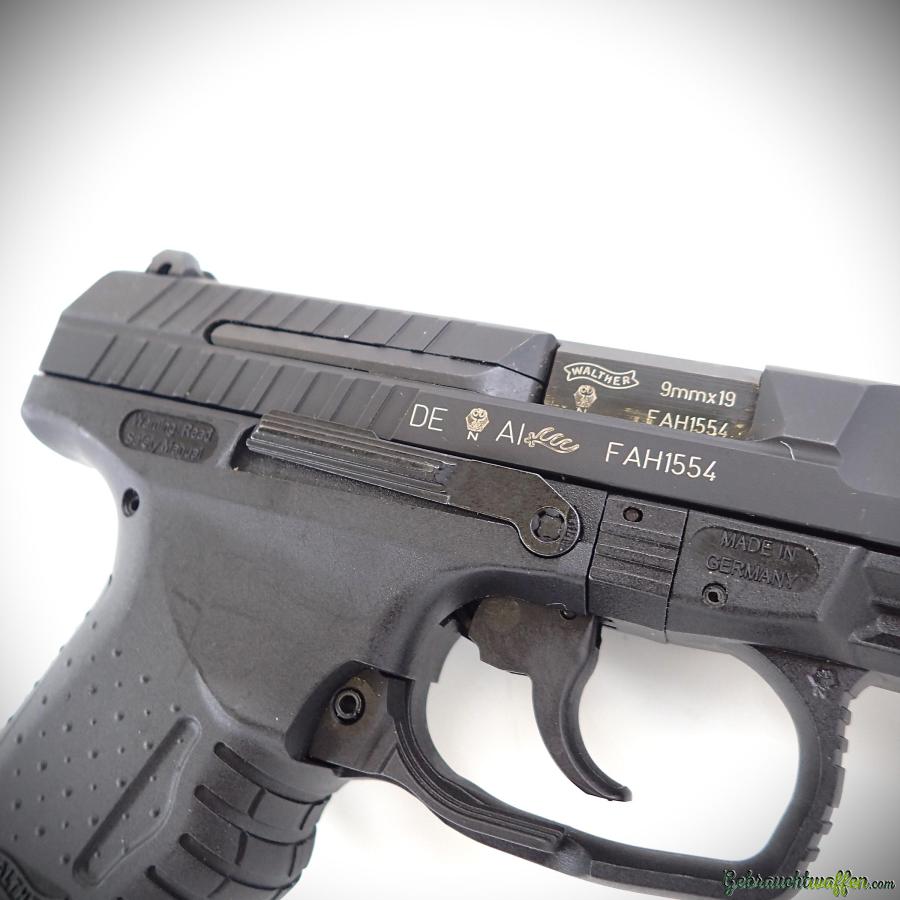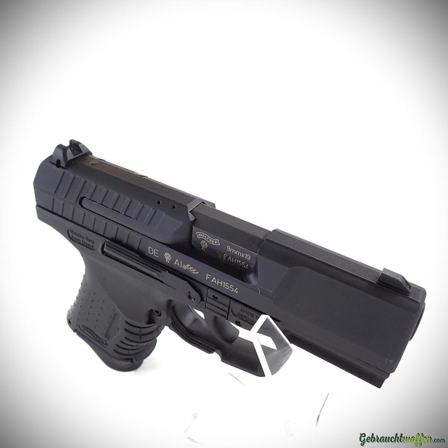 Walther P99C AS Pistole, Kaliber 9 mm P, Kompaktmodell mit Polymerrahmen, Schlagbolzenschloss und SA/DA-Abzug, Entspannhebel über dem Verschluss, in exzellentem Zustand, inklusive Koffer, Ersatzgriff und Ersatzmagazin.