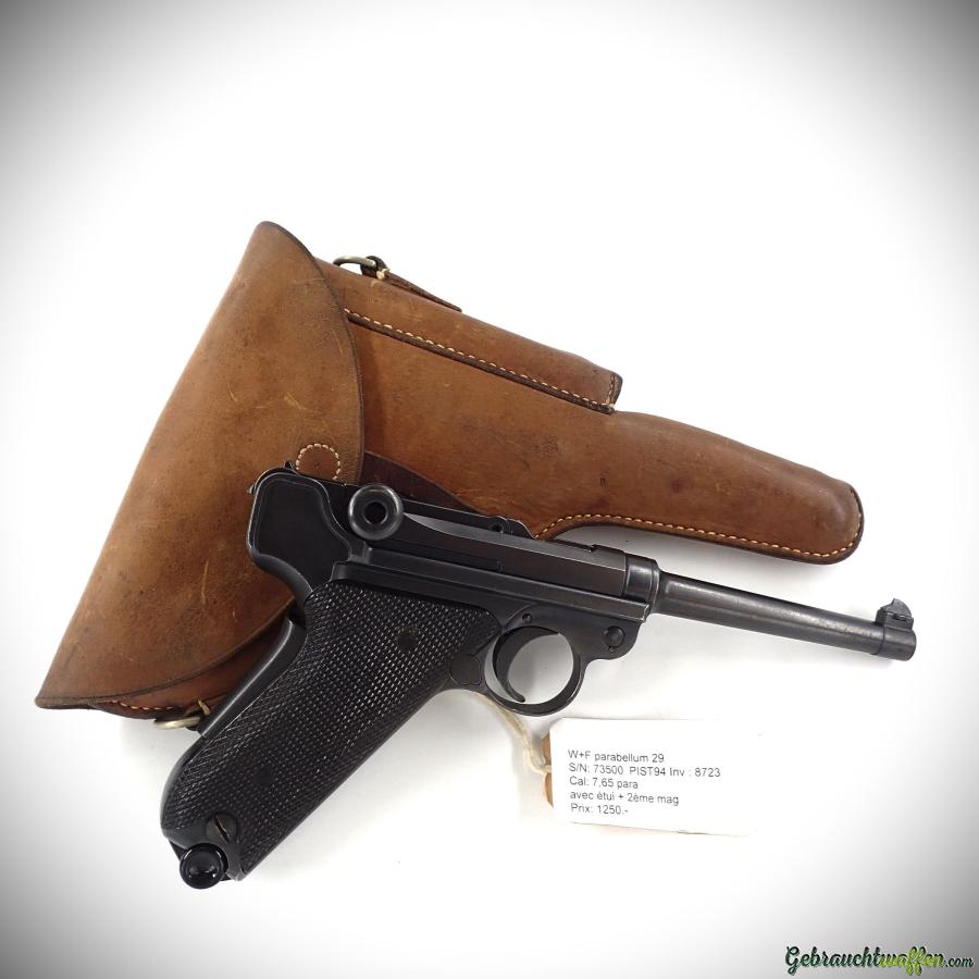 Pistolet W+F mod. Parabellum 29, cal. 7.65P, fabriqué en 1944, en très bon état, livré avec son étui et 2ème chargeur.
