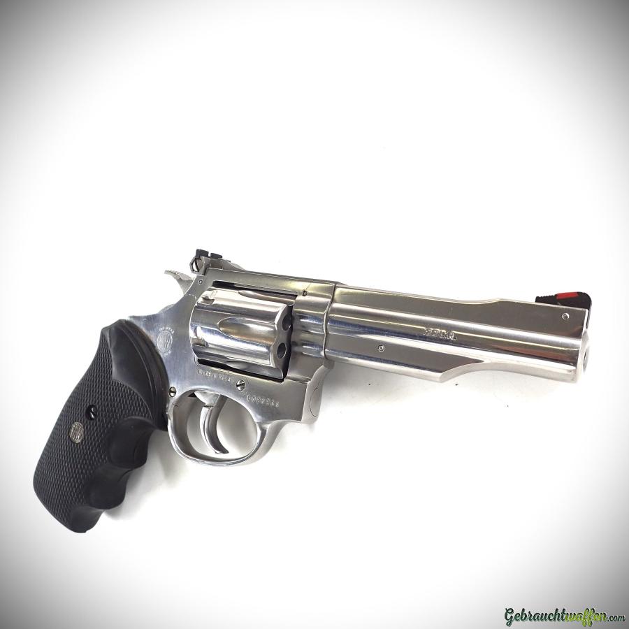 Revolver Rossi mod. M518, cal. 22LR, 6 coups, canon de 4 pouces, hausse réglable et guidon avec insert rouge, poignée caoutchouc, en très bon état.