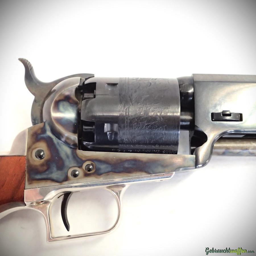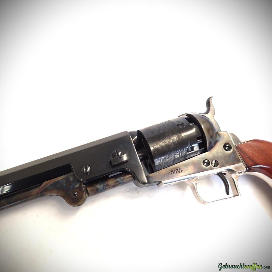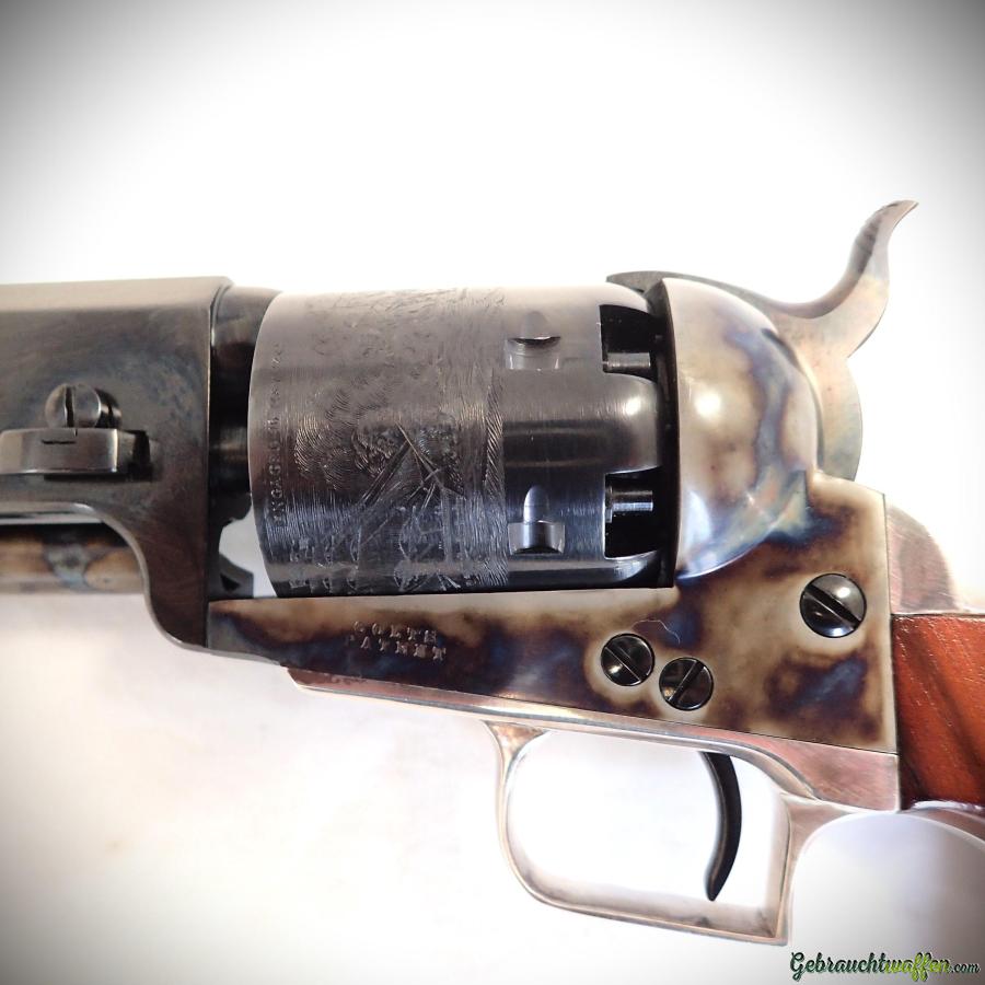 Schwarzpulverrevolver Colt Mod. 1851 Navy, Kal. 36, achteckiger Lauf, jaspiertes Gehäuse, Trommel mit Gravuren, sehr schöne Bronzierung, gebraucht, neu, ungeschossen, mit Holzkiste und Originalzubehör geliefert.