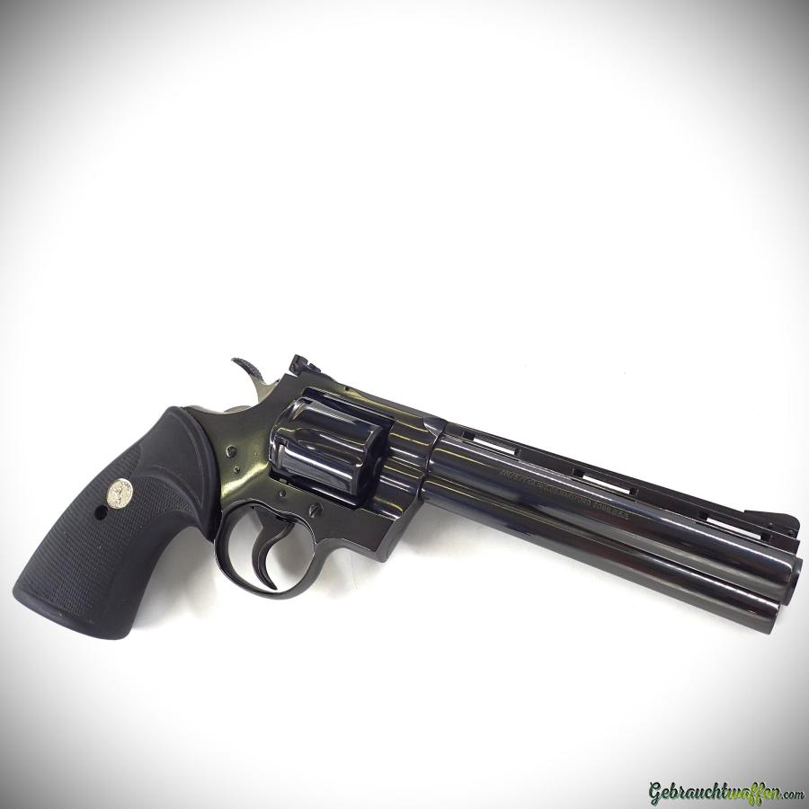Revolver Colt mod. Python .357, cal. 357mag, 6 coups, canon à bande ventilée de 6 pouces, très joli bronzage ''Royal Blue'', hausse réglable, poignée Colt en caoutchouc, fabriqué en 1975, en excellent état.