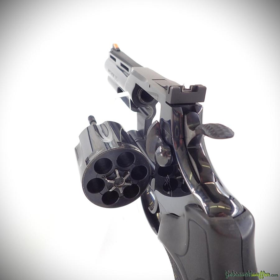 Revolver Colt mod. Python .357, cal. 357mag, 6 coups, canon ventilé de 4 pouces, belle finition "Royal Blue'', hausse réglable, poignée Colt en caoutchouc, fabriqué en 1996, en excellent, livré avec sa boîte d'origine.