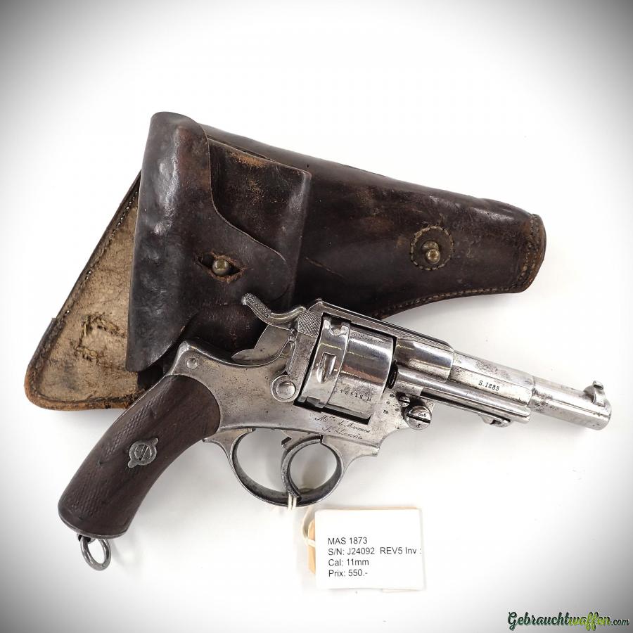 Revolver MAS mod. 1873, cal. 11mm, 6 coups, canon de 4 pouces, finition chromée polie, fabriqué en 1885, en bon état, livré avec son étui cuir.