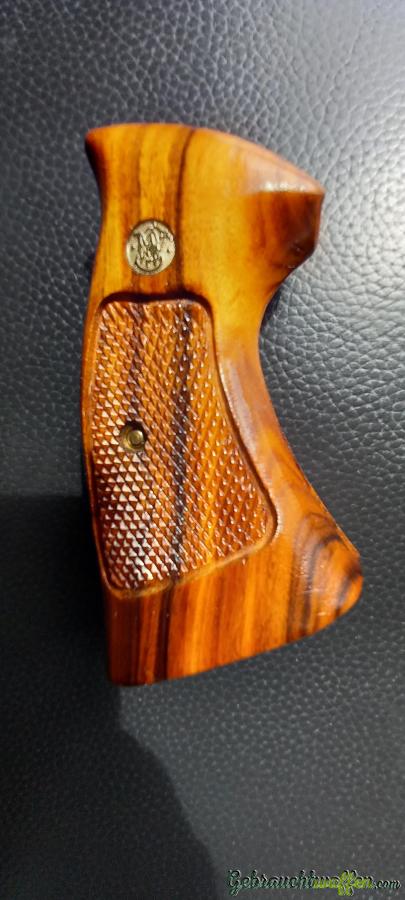 Möglichkeit zum Kauf Originale S&W Masterpiece-Griffbretter aus hochglänzendem amerikanischem Nussbaumholz mit silbernen S&W-Medaillons sind erhältlich – K/L-Rahmen, eckiger Abschluss. Exzellenter Zustand. Preis: 150 Franken Aufpreis (siehe Foto).