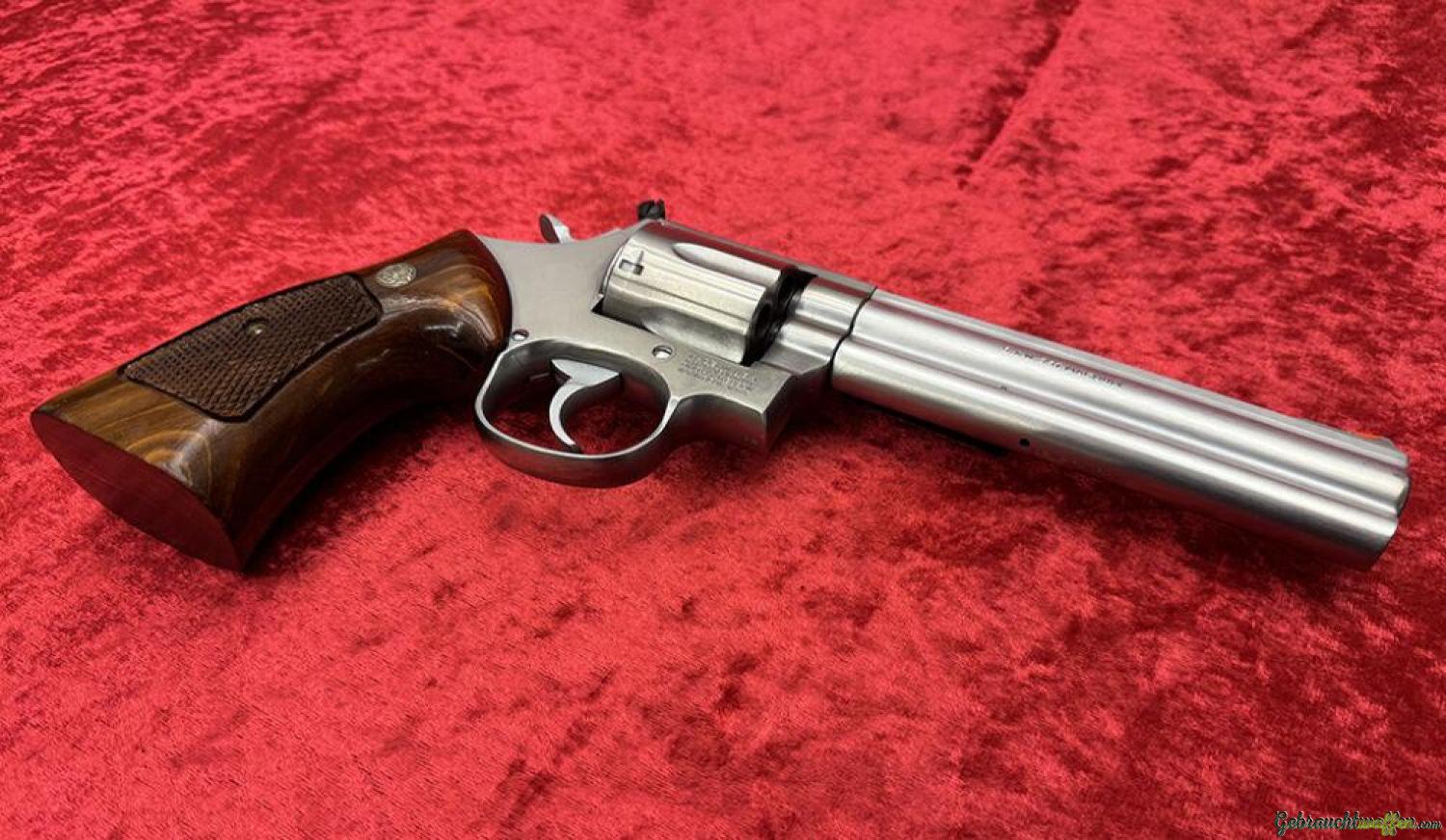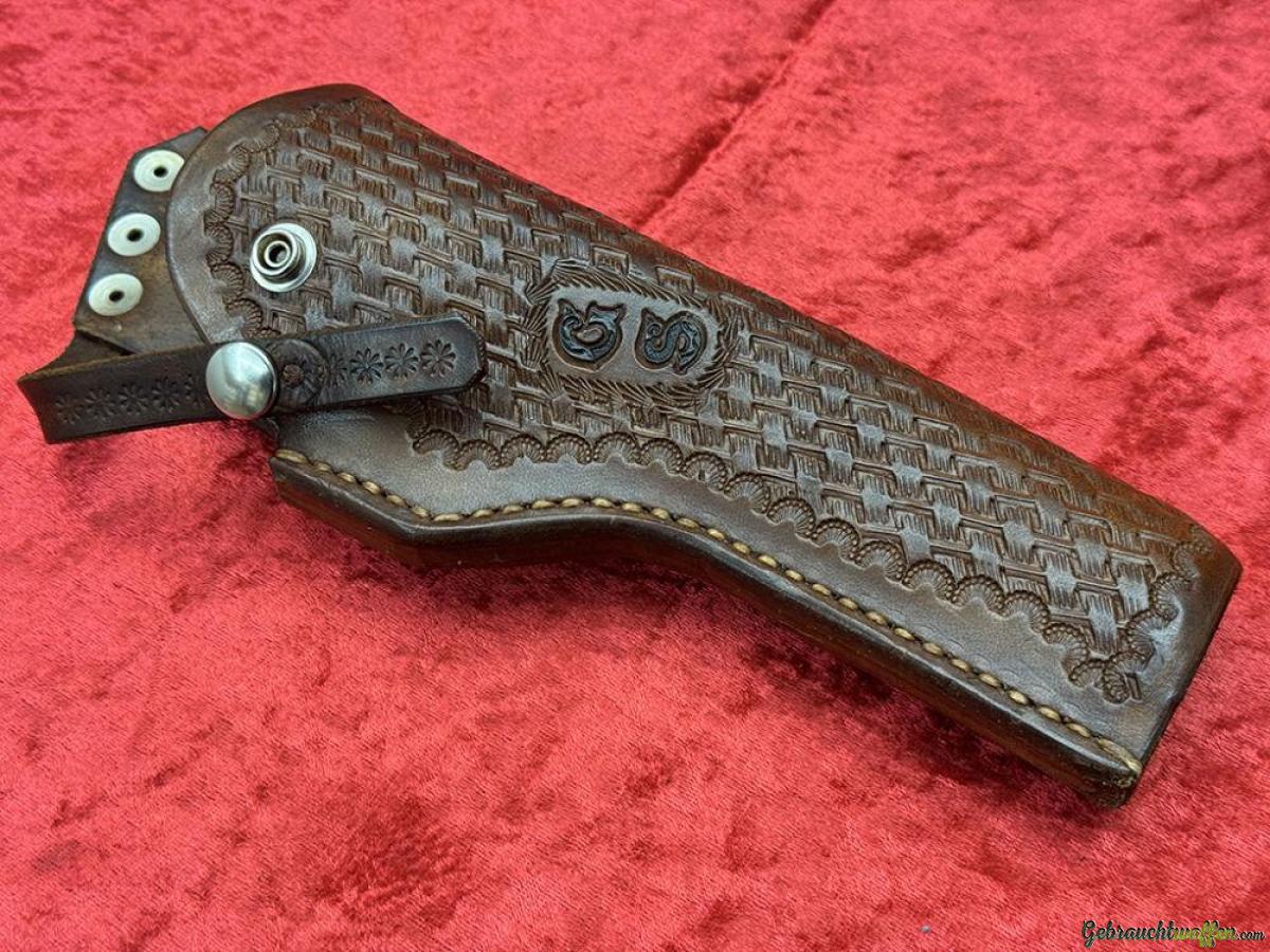 Der Smith & Wesson 686-3 ist eine überarbeitete Version des berühmten Revolvers 686. Dieses Modell kam Anfang der 1990er Jahre auf den Markt und wies gegenüber den Vorgängermodellen mehrere Verbesserungen auf. Neben seiner Zuverlässigkeit und den verbesserten Sicherheitsmerkmalen ist die integrierte Verriegelung eine der wichtigsten Neuerungen wichtigsten Neuerungen, die später zur Standardausstattung der -3-Serie wurden. Darüber hinaus behielt sie ihre klassischen Merkmale bei, wie das verstellbare Visier und den schweren Griff. Technisch gesehen blieb die Smith & Wesson 686-3 dem robusten L-Frame-Rahmen treu, der ideal für die .357 Magnum ist. Sie wird mit einem edlen Lederholster geliefert. Diese Smith & Wesson wurde in Belgien getestet und von Akah importiert. Der Seriennummer nach zu urteilen, wurde dieser Revolver 1990 hergestellt.