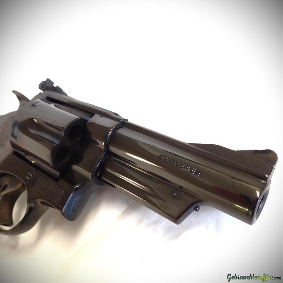 Revolver Smith & Wesson, Mod. 57, Kal. 41Mag, 4-Zoll-Lauf, hergestellt 1973, in ausgezeichnetem Zustand, geliefert mit hölzerner Display-Box, Original-Papiere und Zubehör. Es besteht die Möglichkeit, das notwendige Material zum Wiederladen der .41mag-Patrone zu kaufen.