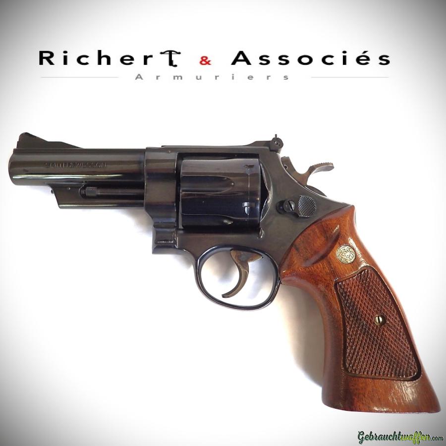 Revolver Smith & Wesson, mod. 57, cal. 41Mag, canon de 4 pouces, fabriqué en 1973, en excellent état, livré avec sa boîte-présentoir en bois, papiers et accessoires d'origine. Possibilité d'achat du matériel nécessaire pour la recharge de la cartouche .41mag.