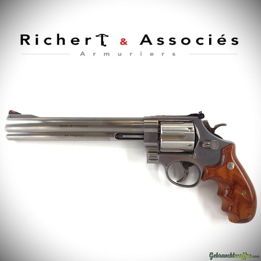 Revolver S&W modèle 629-4 Classic DX, cal. 44mag, 6 coups, canon de 8-3/8 pouces, hausse réglable et guidon amovible, fabriqué en 1993, en excellent état, livré avec sa boîte d'origine et 2 paires de plaquettes (bois + caoutchouc).