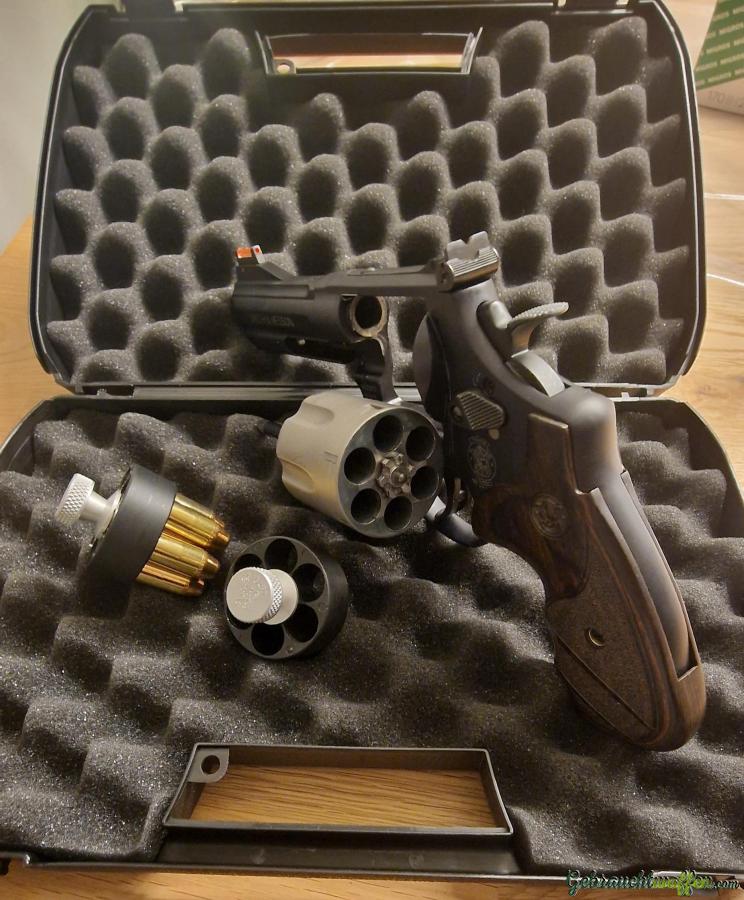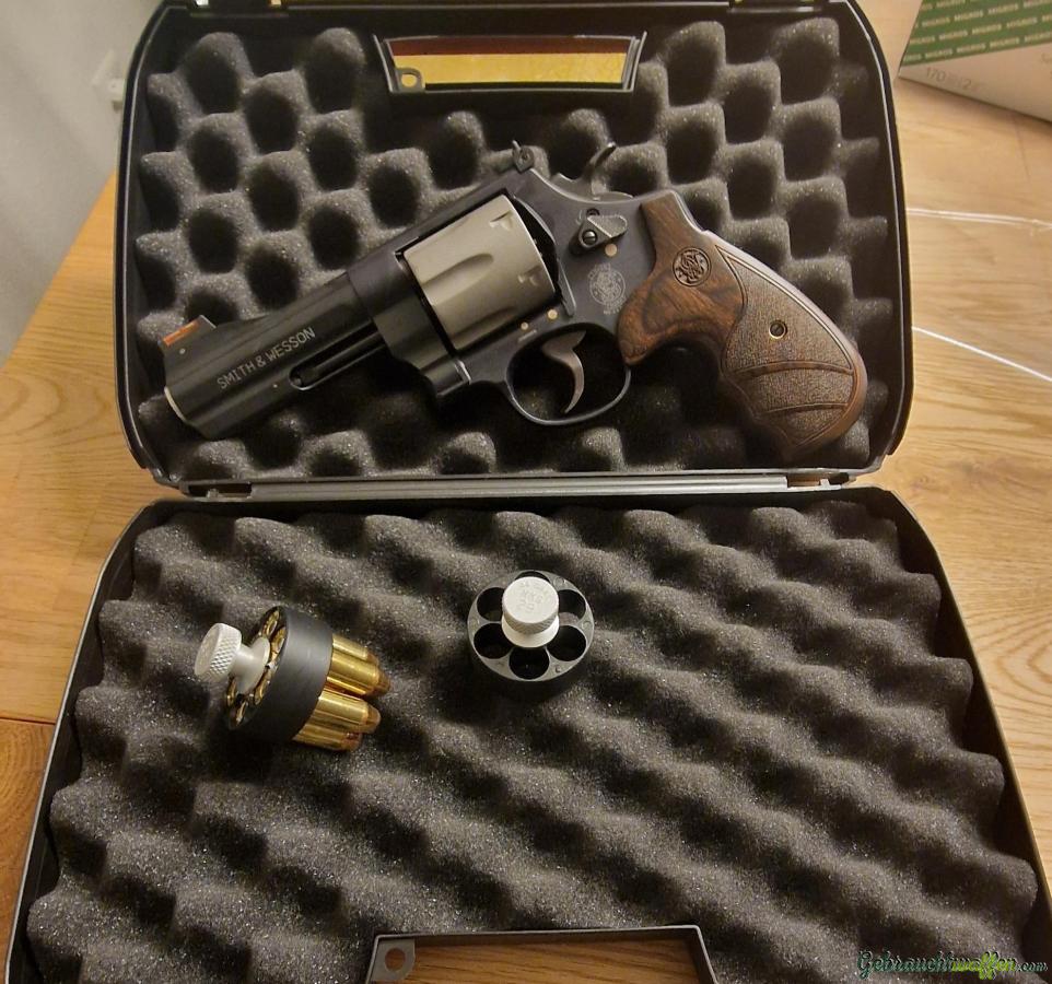Revolver Smith & Wesson, Mod. 329 PD, Kal. 44mag, 6 Schuss, 4,125 -Zoll-Lauf, „AirLite“-Gehäuse aus Aluminium/Skandium-Legierung, verstellbare Kimme, Korn mit roter Faser, gebraucht sehr wenig geschossen.
