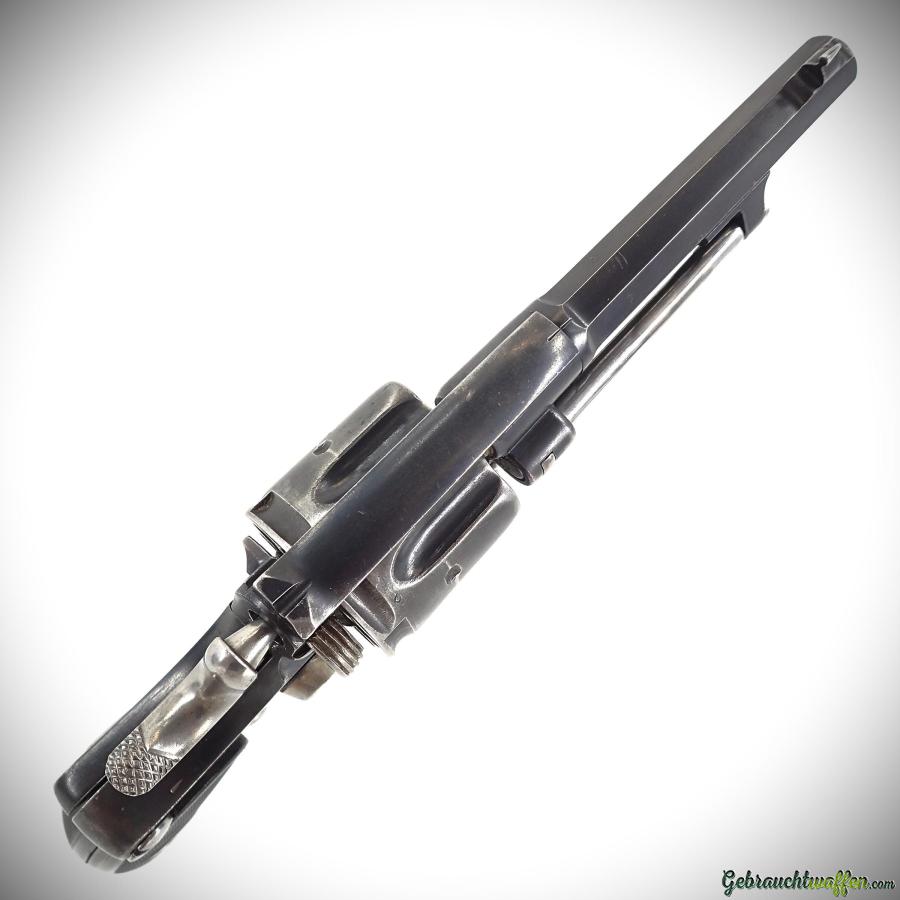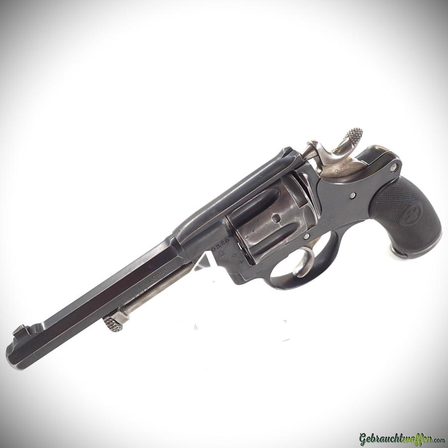 Revolver W+F mod. 1882. cal. 7.5Rev, 6 coups, détente SA/DA, canon octogonal de 4 pouces, version avec les plaquettes en bakélite, modèle des douanes Suisses, fabriqué en 1909, en très bon état, livré avec son étui de douane et sangle.