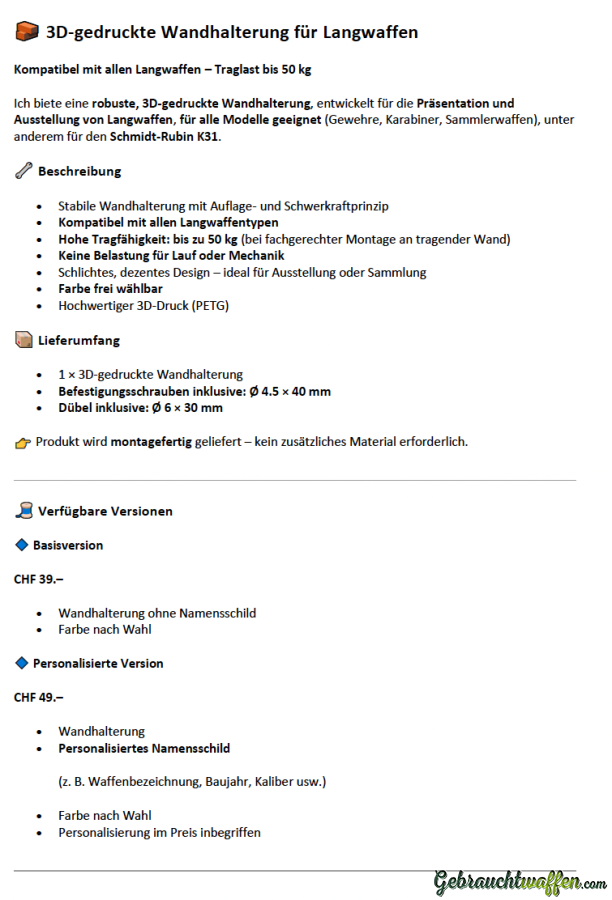 Ich biete eine robuste, 3D-gedruckte Wandhalterung, entwickelt für die Präsentation und Ausstellung von Langwaffen. Geeignet für alle Modelle (Gewehre, Karabiner, Sammlerwaffen), unter anderem für den Schmidt-Rubin K31.