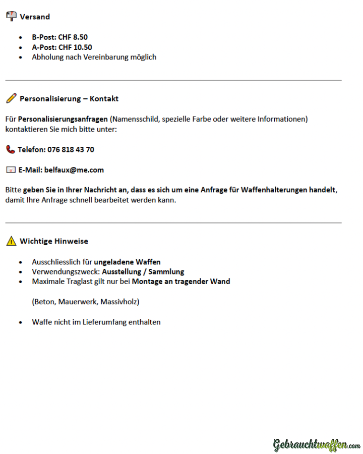 Bitte geben Sie in Ihrer Nachricht an, dass es sich um eine Anfrage für Waffenhalterungen handelt, damit Ihre Anfrage schnell bearbeitet werden kann.