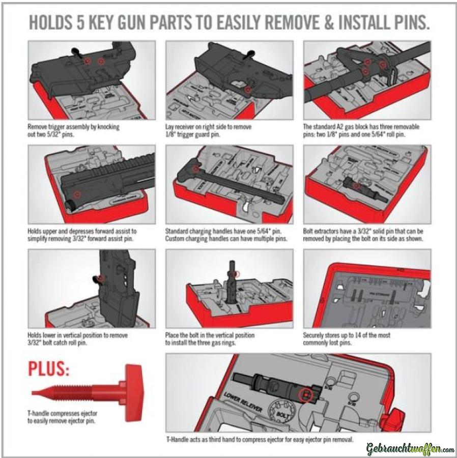 Enables removal/installation of 13 different pins & gas rings