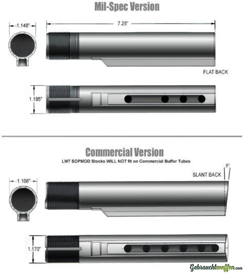 Verkaufe neuen unbenutzten Buffertube 6 Positionen in der grösse Commercial passen AR15 M16 M4 und Klone mit dem selben Gewinde. Castlenut, Collar und Bufferfedern und Buffers sind vorhanden.