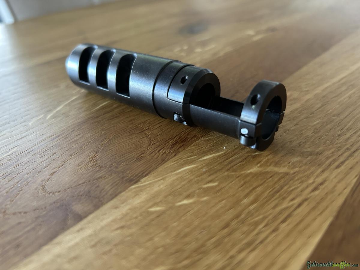 Mündungsbremse für den Karabiner 31 zum aufklemmen. Material Stahl brüniert. Montage erfolgt ohne Änderung bzw. Modifikation an der Waffe. Made in Germany. 110x26mm / 251g