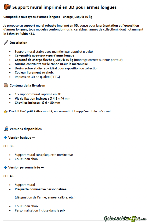 Je propose un support mural robuste imprimé en 3D, conçu pour la présentation et l’exposition d’armes longues. Compatible avec tous les modèles (fusils, carabines, armes de collection), notamment le Schmidt-Rubin K31.