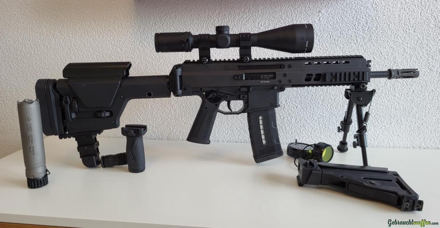 Neuwertiger B&T APC 556 mit ZF Trijicon (2.5-10x56), in Fullauto und Einzelschuss, 30+30+20 Schussmagazine, Klappschaft original (klein und handlich) und Magpul verstellbar (Länge und Höhe, PRS GEN3), inkl. B&T original Schalldämpfer mit Verstellbarer 2-Beinstütze und Erdsporn. Bei Fragen einfach melden. Kann besichtigt werden, Lieferung/Abholung nach Absprache. Weitere Bilder auf Anfrage (e-Mail). Nur gegen Sonderbewilligung, wegen SD 2 Positionen!!