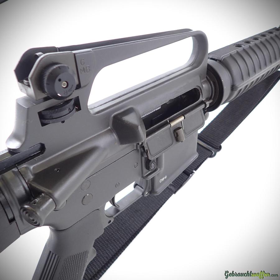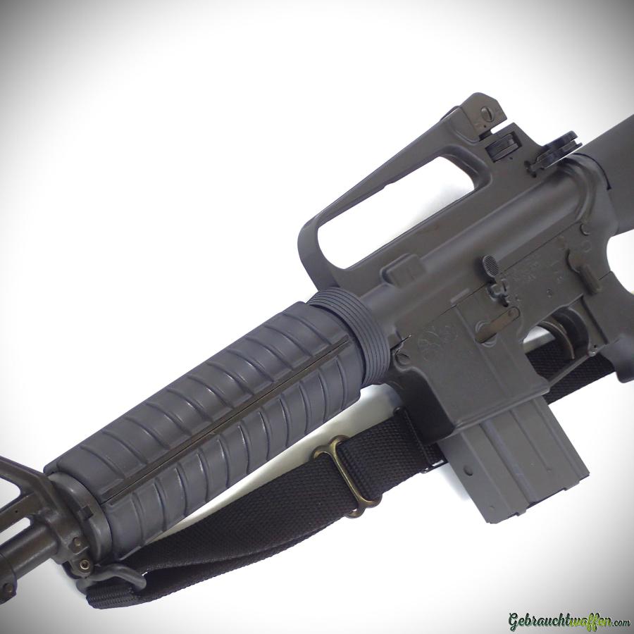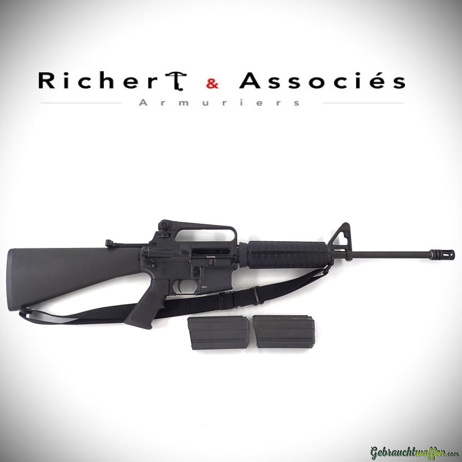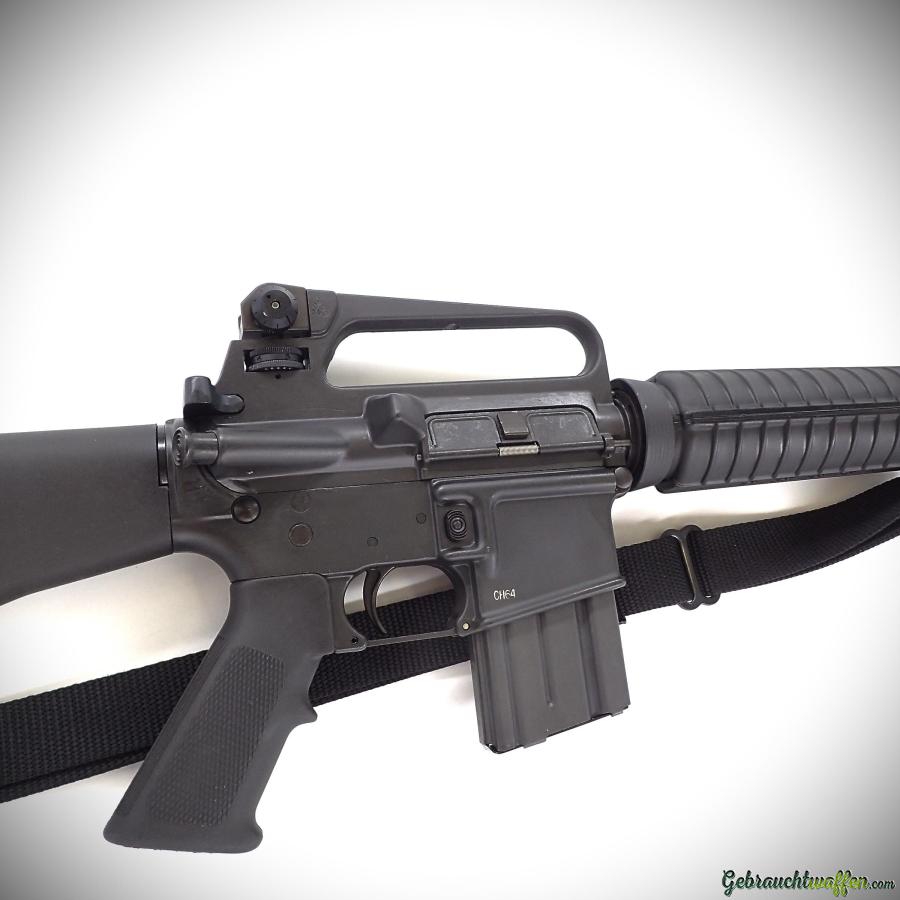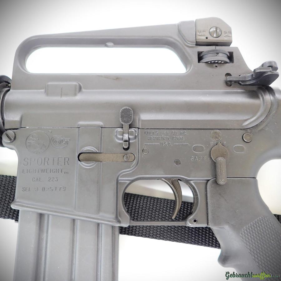 Colt-Karabiner Mod. AR15 Sporter Lightweight, cal. 223Rem, original Halbautomatik, Version mit leichterem Lauf, fester Schaft, verstellbare Kimme, in ausgezeichnetem Zustand, Lieferung mit Schultergurt und 2 x 15-Schuss-Magazinen. Kann mit einfacher PAA gekauft werden, wenn sie mit 10-Schuss-Magazinen geliefert wird.