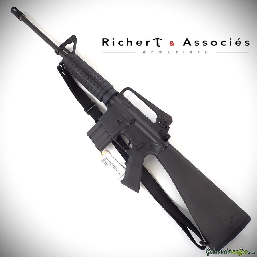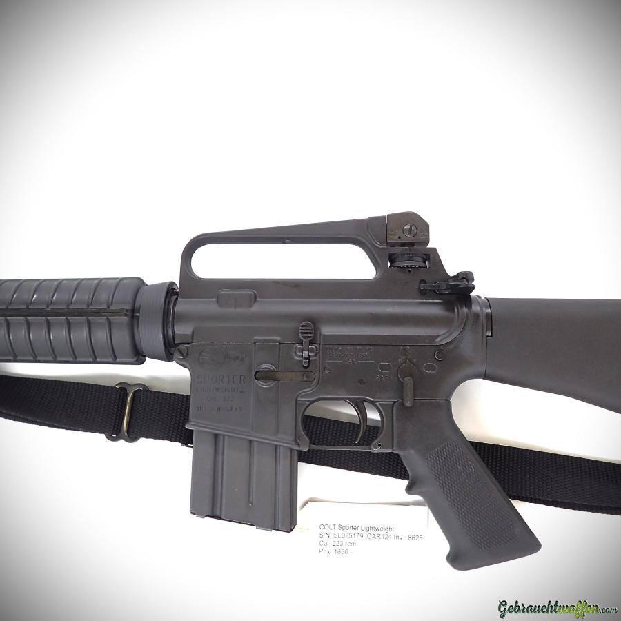 Carabine Colt mod. AR15 Sporter Lightweight, cal. 223Rem, semi-automatique d'origine, version à canon allégé, crosse fixe, hausse réglable, en excellent état, livré avec une bandoulière et 2 chargeurs de 15 coups. Peut être achetée avec PAA simple si livrée avec des chargeurs de 10 coups.