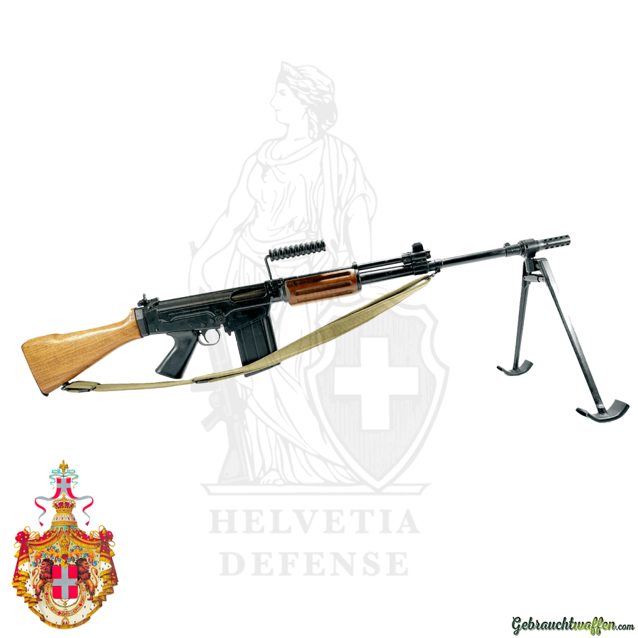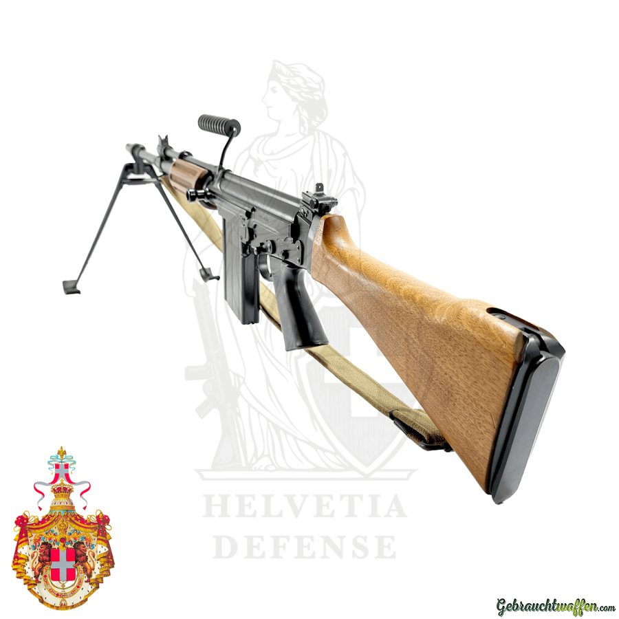 Dieses Exemplar ist im Kaliber .308 Winchester / 7.62×51 NATO ausgeführt und verfügt über eine Vollautomatik-Funktion. Der klassische Holzschaft unterstreicht die traditionelle Ästhetik der frühen FAL-Modelle und verleiht dem Gewehr seinen charakteristischen militärhistorischen Charme.