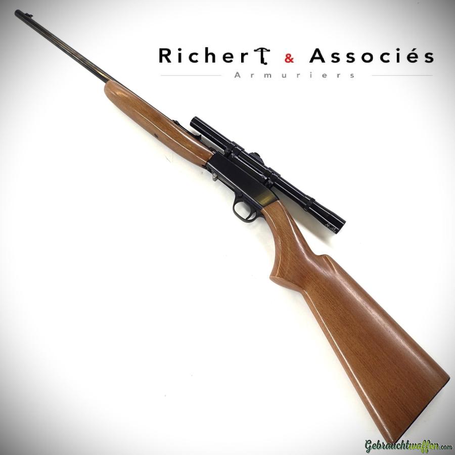 Carabine FN mod. Semi-Automatique, cal. 22LR, démontable (take-down), hausse réglable en hauteur, crosse et garde-main en bois lisse, en très bon état, livré avec une lunette.