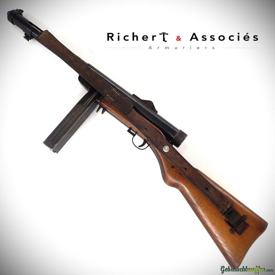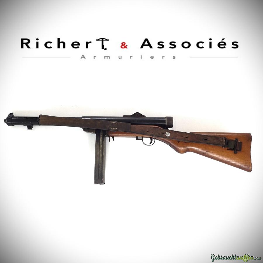 Hispano-Suiza machine pistol, mod. MP43/44, cal. 9mmP, original automatic weapon, in very good mechanical and working condition, shows normal signs and marks of wear, delivered with 4 magazines and carrying case and a "camembert" magazine.