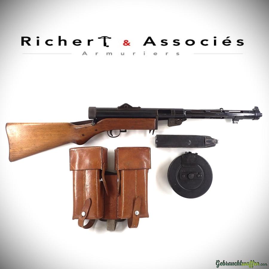 Pistolet-mitrailleur Hispano-Suiza, mod. MP43/44, cal. 9mmP, arme automatique d'origine, en très bon état mécanique et de fonctionnement, présente des traces et marques normales d'usure, livré avec 4 chargeurs et la sacoche de transport et un chargeur type ''camembert''.