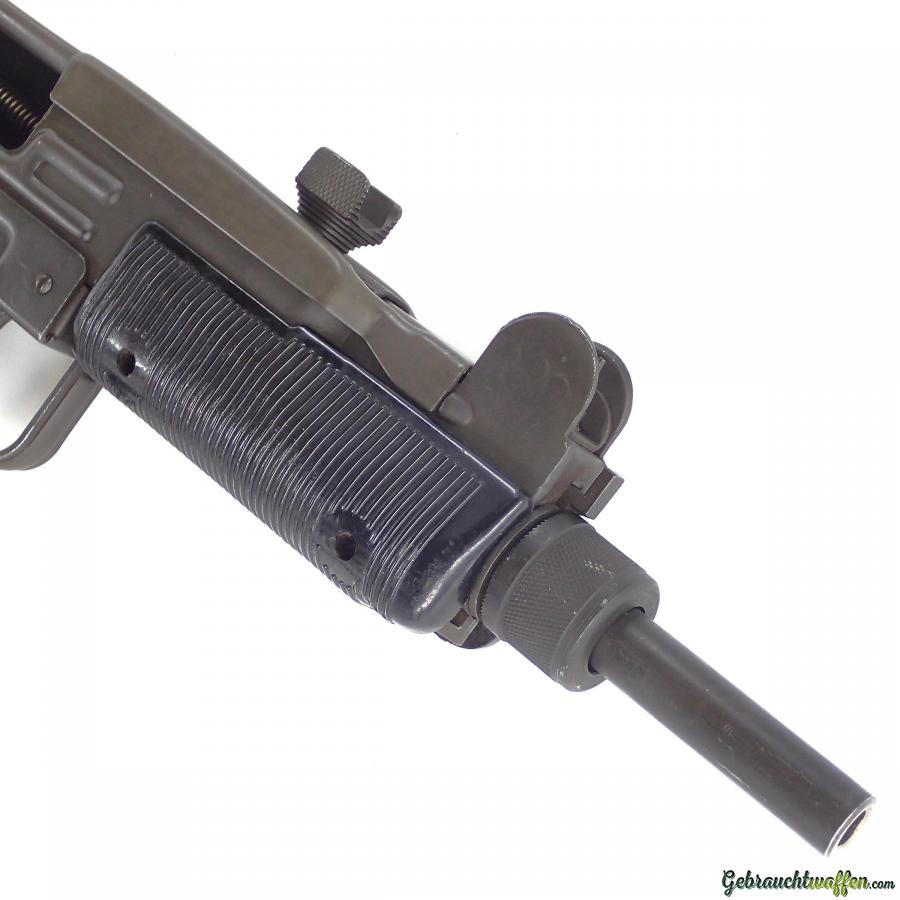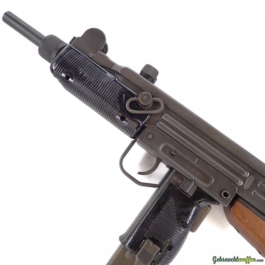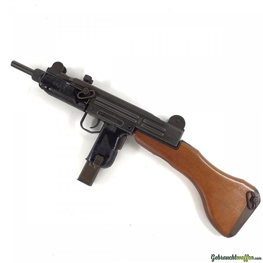 Maschinenpistole IMI, Mod. UZI Standard, Kal. 9mmP, hergestellt 1961, in sehr gutem Zustand, wahrscheinlich nie geschossen, mit Holzgriff, braunem Lederriemen und 2 Magazinen (1 x 25 Schuss und 1 x 32 Schuss).