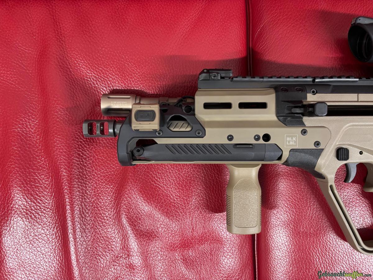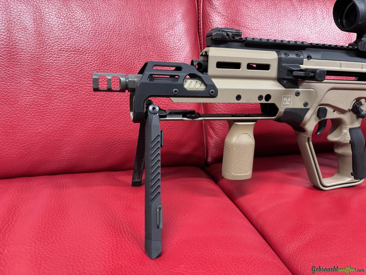 Es kommt mit dem hochwertigen Black Label Handschutz mit integriertem Zweibein, dem ergonomischeren Schulter-Pad von Manticore Arms und einer B&T Mündungsbremse (Kompensator).
