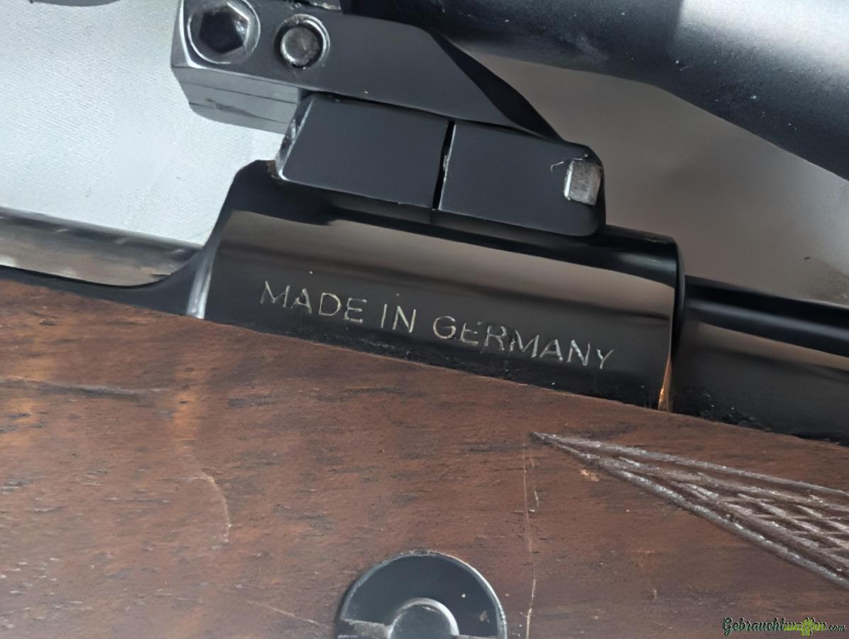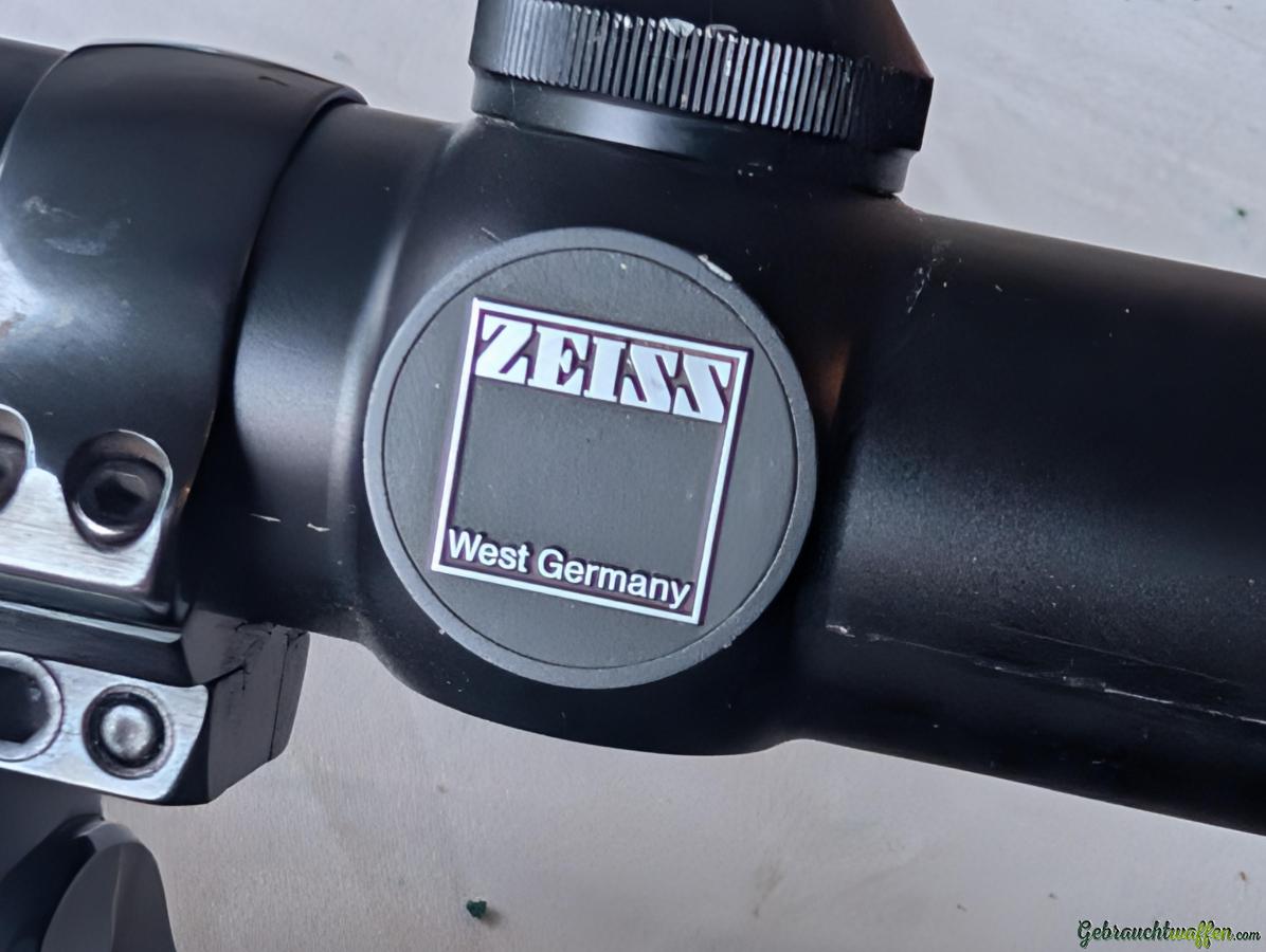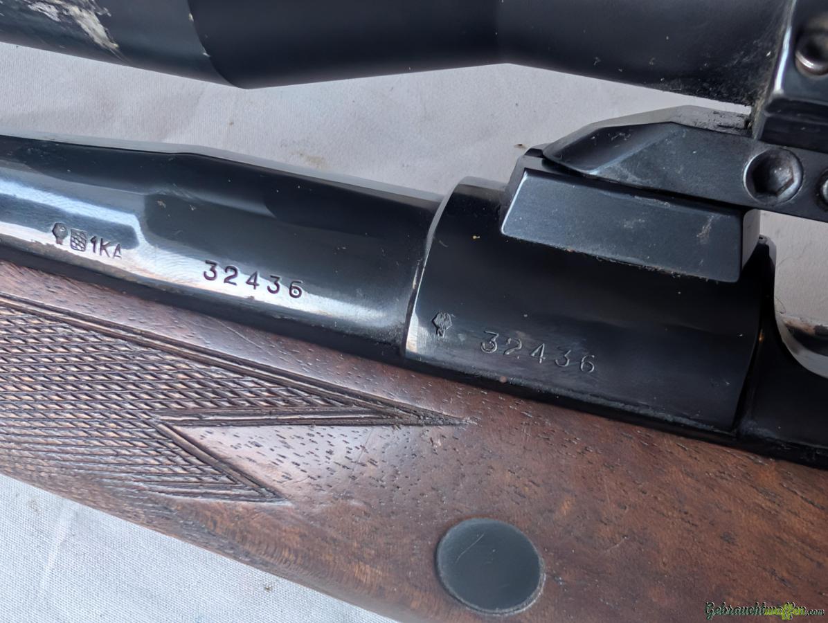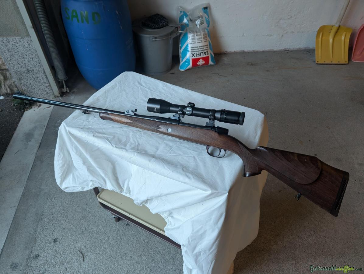 Die Büchse befindet sich in einem sehr gepflegten Zustand mit einwandfreier Brünierung. Der formschöne Nussholzschaft mit klassischer Backe und griffiger Fischhaut unterstreicht die wertige Optik dieses Jagdgewehrs. Montiert ist ein lichtstarkes Zielfernrohr der Marke Zeiss (Diavari-Z 1,5–6x42 T*), das dank der bewährten T*-Mehrschichtvergütung auch bei schwierigen Lichtverhältnissen eine kontrastreiche und scharfe Abbildung garantiert. Die Optik hat einige äussere Gebrauchsspuren, die Funktion ist aber nicht beeinträchtigt.
