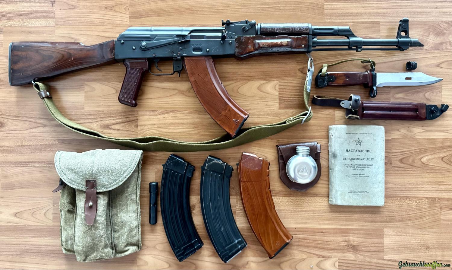 Verkaufe russische Kalaschnikov AKM Izhmash, 7.62x39mm, aus dem Jahre 1963; umgebaut auf Semiauto. Originalzustand und komplett nummerngleich inkl. Vordergriffstück, Abzug etc. Zur Waffe wird folgendes Zubehör geliefert (im Preis inbegriffen):