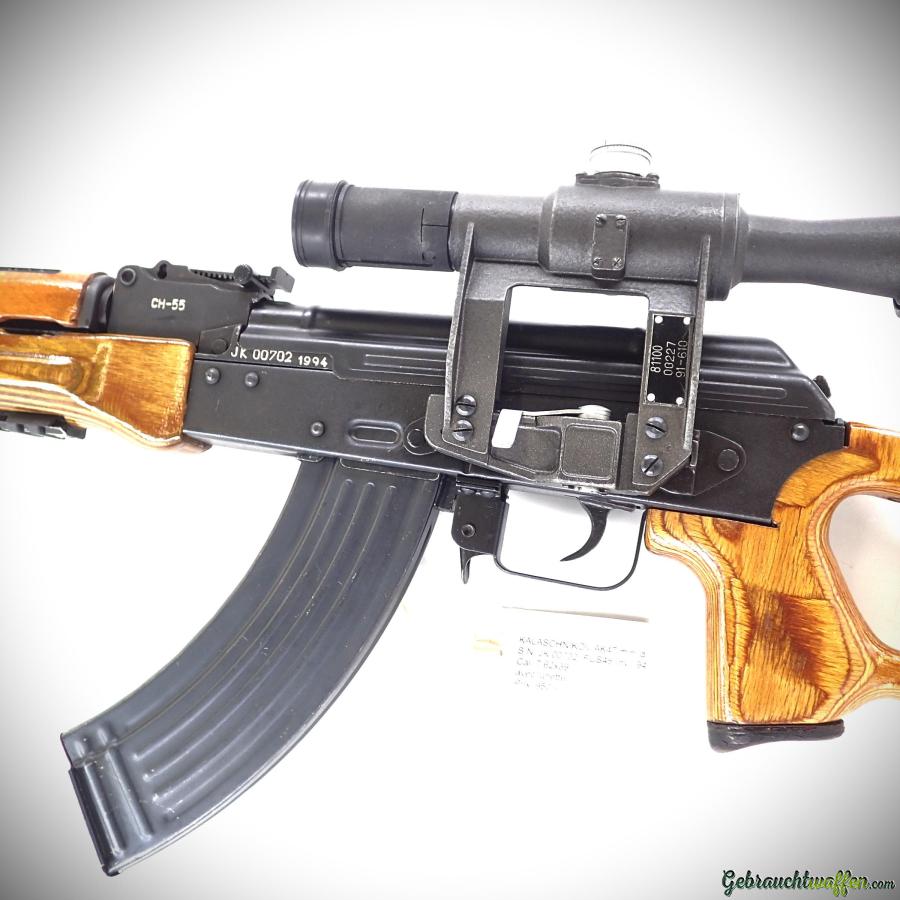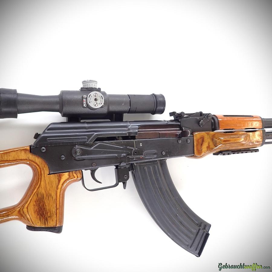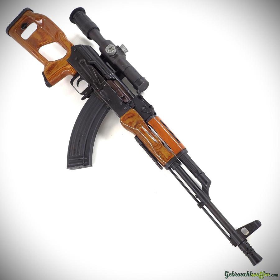 Kalashnikov AK-47 rifle, 7.62x39 caliber, semi-automatic, originally equipped with a Dragunov-style stock, in very good condition, comes with a scope and a 20-round magazine. A pistol grip is sufficient if supplied with a 10-round magazine.